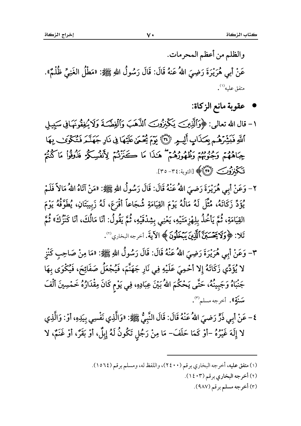 3 - وَعَنْ أبِي هُرَيْرَةَ رَضِيَ اللهُ عَنْهُ قَالَ: قَالَ رَسُولُ اللهِ - صلى الله عليه وسلم -: «مَا مِنْ صَاحِبِ كَنْزٍ لا يُؤَدِّي زَكَاتَهُ إِلا أحْمِيَ عَلَيْهِ فِي نَارِ جَهَنَّمَ، فَيُجْعَلُ صَفَائِحَ، فَيُكْوَى بِهَا جَنْبَاهُ وَجَبِينُهُ، حَتَّى يَحْكُمَ اللهُ بَيْنَ عِبَادِهِ، فِي يَوْمٍ كَانَ مِقْدَارُهُ خَمْسِينَ ألْفَ سَنَةٍ». أخرجه مسلم (¬3).