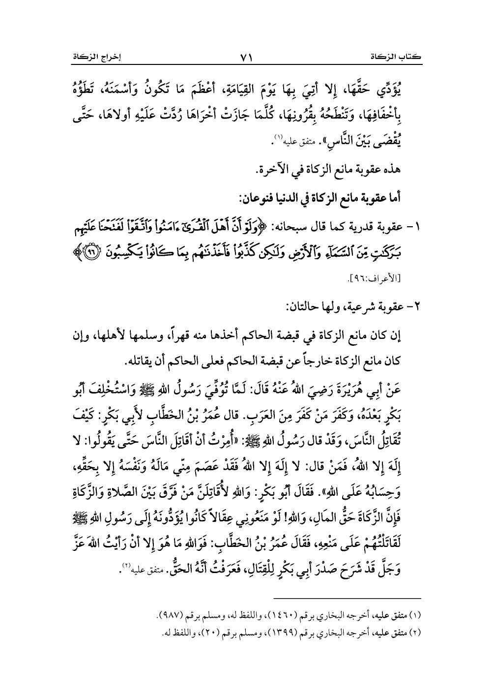 عَنْ أبِي هُرَيْرَةَ رَضِيَ اللهُ عَنْهُ قَالَ: لَمَّا تُوُفِّيَ رَسُولُ اللهِ - صلى الله عليه وسلم - وَاسْتُخْلِفَ أبُو بَكْرٍ بَعْدَهُ، وَكَفَرَ مَنْ كَفَرَ مِنَ العَرَبِ. قال عُمَرُ بْنُ الخَطَّابِ لأَبِي بَكْرٍ: كَيْفَ تُقَاتِلُ النَّاسَ، وَقَدْ قال رَسُولُ اللهِ - صلى الله عليه وسلم -: «أُمِرْتُ أنْ أقَاتِلَ النَّاسَ حَتَّى يَقُولُوا: لا إِلَهَ إِلا اللهُ، فَمَنْ قال: لا إِلَهَ إِلا اللهُ فَقَدْ عَصَمَ مِنّي مَالَهُ وَنَفْسَهُ إِلا بِحَقِّهِ، وَحِسَابُهُ عَلَى اللهِ». فَقَالَ أبُو بَكْرٍ: وَاللهِ لأُقَاتِلَنَّ مَنْ فَرَّقَ بَيْنَ الصَّلاةِ وَالزَّكَاةِ فَإِنَّ الزَّكَاةَ حَقُّ المَالِ، وَاللهِ! لَوْ مَنَعُونِي عِقَالاً كَانُوا يُؤَدُّونَهُ إِلَى رَسُولِ اللهِ - صلى الله عليه وسلم - لَقَاتَلْتُهُمْ عَلَى مَنْعِهِ، فَقَالَ عُمَرُ بْنُ الخَطَّابِ: فَوَاللهِ مَا هُوَ إِلا أنْ رَأيْتُ اللهَ عَزَّ وَجَلَّ قَدْ شَرَحَ صَدْرَ أبِي بَكْرٍ لِلْقِتَالِ، فَعَرَفْتُ أنَّهُ الحَقُّ. متفق عليه (¬2).