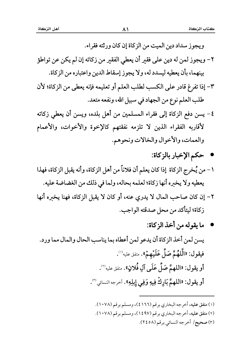 4 - يسن دفع الزكاة إلى فقراء المسلمين من أهل بلده، ويسن أن يعطي زكاته لأقاربه الفقراء الذين لا تلزمه نفقتهم كالإخوة والأخوات، والأعمام والعمات، والأخوال والخالات ونحوهم.