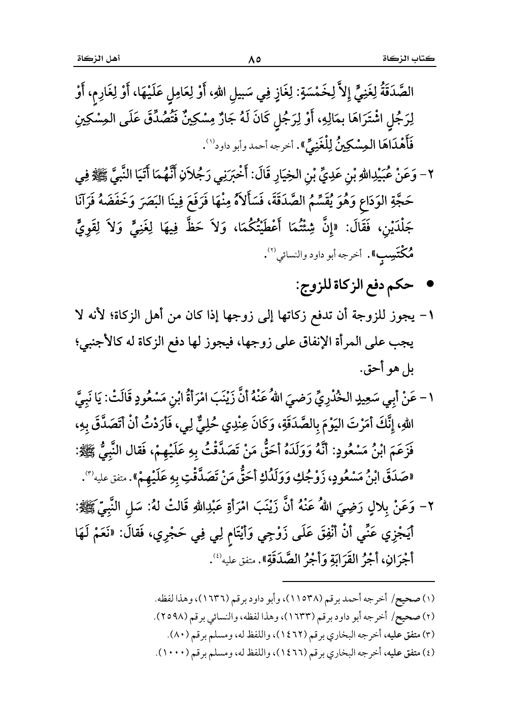 1 - عَنْ أبِي سَعِيدٍ الخُدْرِيِّ رَضيَ اللهُ عَنْهُ أنَّ زَيْنَبَ امْرَأةُ ابْنِ مَسْعُودٍ قَالَتْ: يَا نَبِيَّ اللهِ، إِنَّكَ أمَرْتَ اليَوْمَ بِالصَّدَقَةِ، وَكَانَ عِنْدِي حُلِيٌّ لِي، فَأرَدْتُ أنْ أتَصَدَّقَ بِهِ، فَزَعَمَ ابْنُ مَسْعُودٍ: أنَّهُ وَوَلَدَهُ أحَقُّ مَنْ تَصَدَّقْتُ بِهِ عَلَيْهِمْ، فَقال النَّبِيُّ - صلى الله عليه وسلم -: «صَدَقَ ابْنُ مَسْعُودٍ، زَوْجُكِ وَوَلَدُكِ أحَقُّ مَنْ تَصَدَّقْتِ بِهِ عَلَيْهِمْ». متفق عليه (¬3).