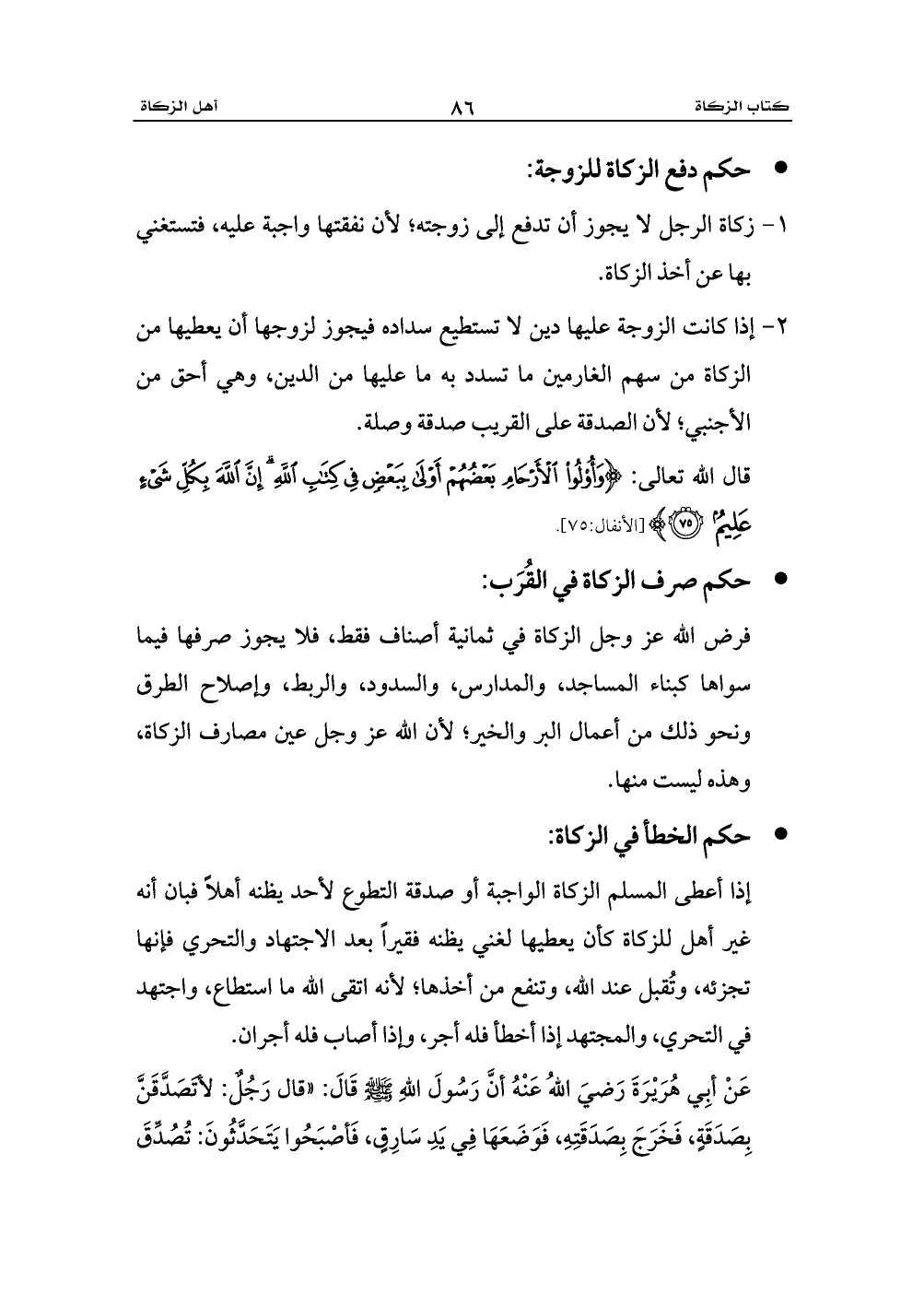 1 - زكاة الرجل لا يجوز أن تدفع إلى زوجته؛ لأن نفقتها واجبة عليه، فتستغني بها عن أخذ الزكاة.