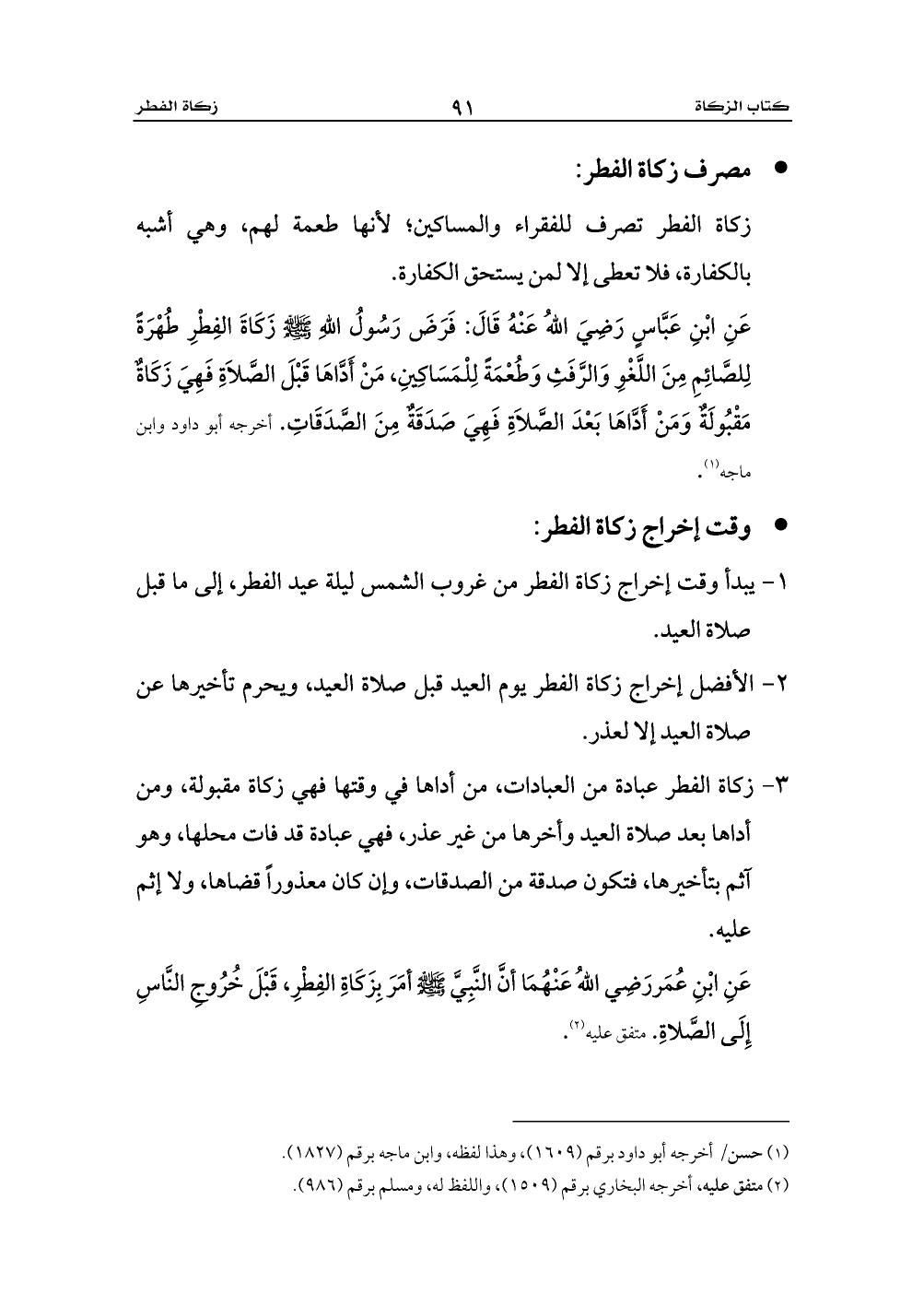 عَنِ ابْنِ عُمَررَضِي اللهُ عَنْهُمَا أنَّ النَّبِيَّ - صلى الله عليه وسلم - أمَرَ بِزَكَاةِ الفِطْرِ، قَبْلَ خُرُوجِ النَّاسِ إِلَى الصَّلاةِ. متفق عليه (¬2).