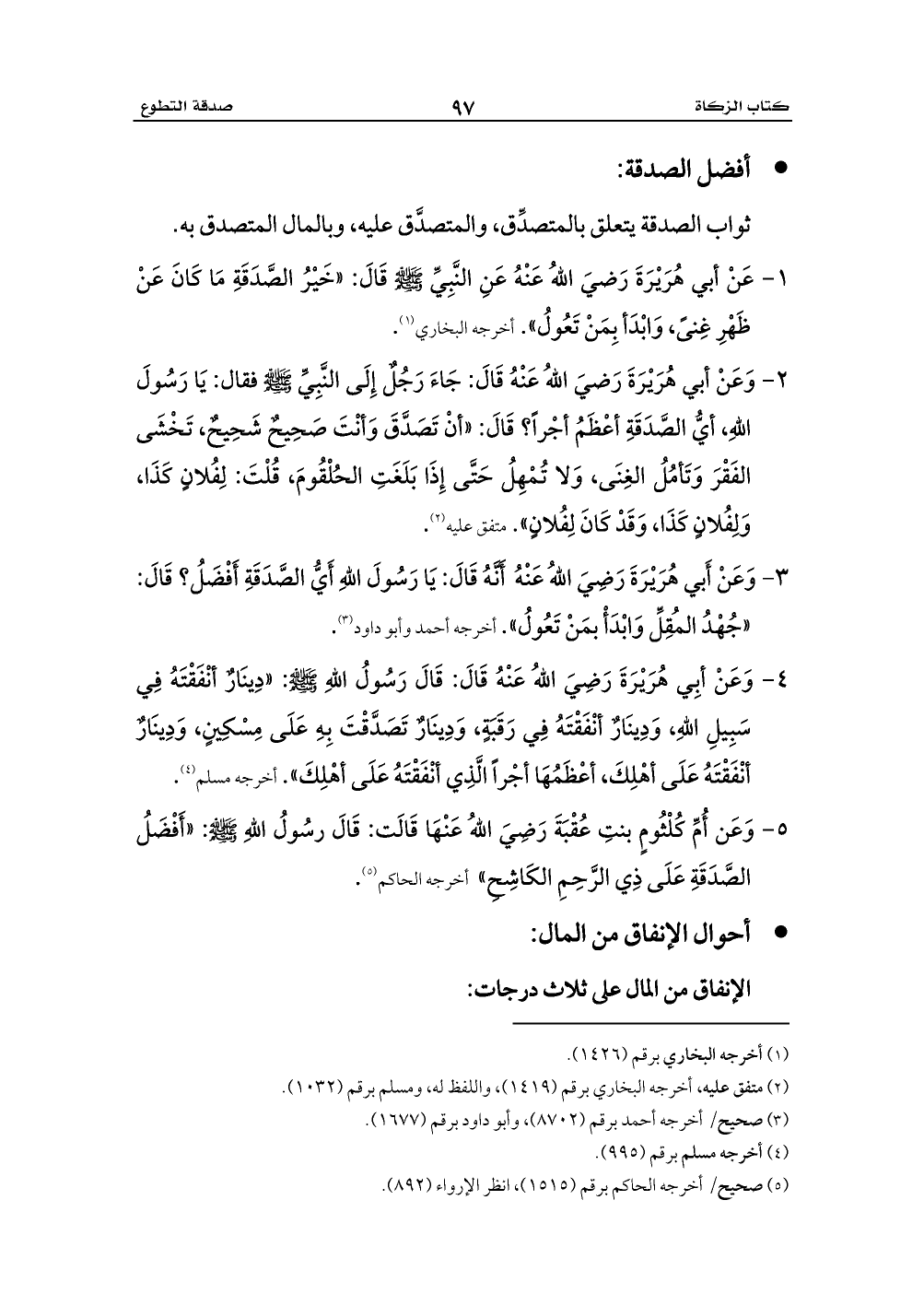 1 - عَنْ أبي هُرَيْرَةَ رَضيَ اللهُ عَنْهُ عَنِ النَّبِيِّ - صلى الله عليه وسلم - قَالَ: «خَيْرُ الصَّدَقَةِ مَا كَانَ عَنْ ظَهْرِ غِنىً، وَابْدَأ بِمَنْ تَعُولُ». أخرجه البخاري (¬1).
