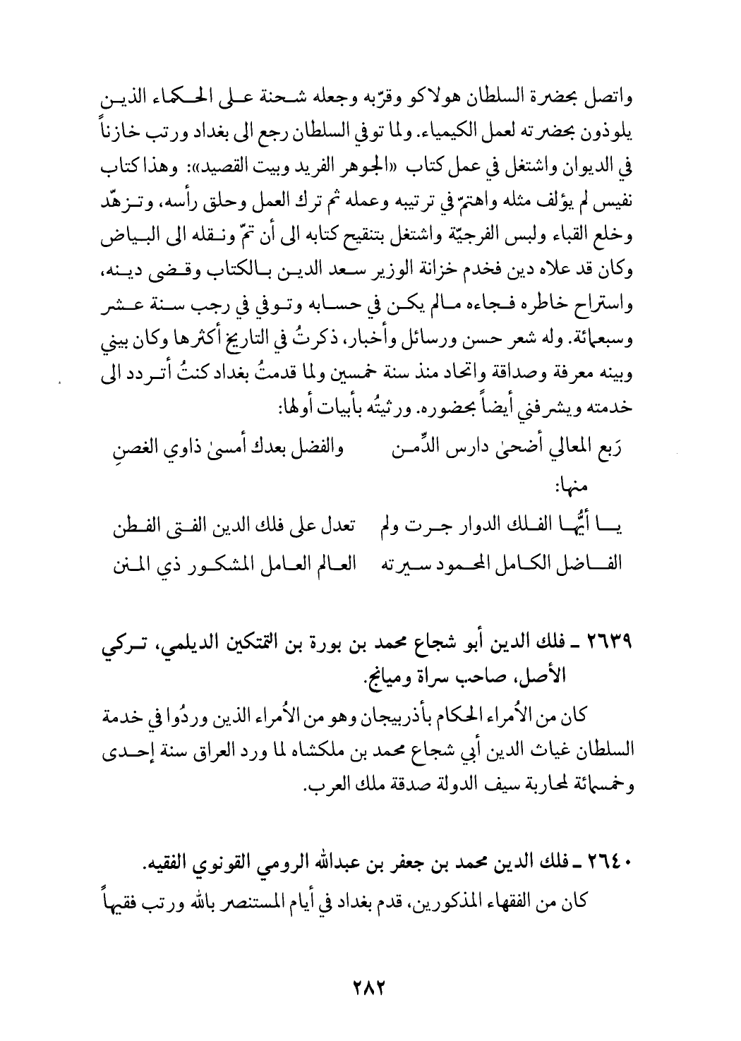 واتصل بحضرة السلطان هولاكو وقرّبه وجعله شحنة على الحكماء الذين يلوذون بحضرته لعمل الكيمياء. ولما توفي السلطان رجع الى بغداد ورتب خازنا في الديوان واشتغل في عمل كتاب «الجوهر الفريد وبيت القصيد»: وهذا كتاب نفيس لم يؤلف مثله واهتمّ في ترتيبه وعمله ثم ترك العمل وحلق رأسه، وتزهّد وخلع القباء ولبس الفرجيّة واشتغل بتنقيح كتابه الى أن تمّ ونقله الى البياض وكان قد علاه دين فخدم خزانة الوزير سعد الدين بالكتاب وقضى دينه، واستراح خاطره فجاءه ما لم يكن في حسابه وتوفي في رجب سنة عشر وسبعمائة. وله شعر حسن ورسائل وأخبار، ذكرت في التاريخ أكثرها وكان بيني وبينه معرفة وصداقة واتحاد منذ سنة خمسين ولما قدمت بغداد كنت أتردد الى خدمته ويشرفني أيضا بحضوره. ورثيته بأبيات أولها:
