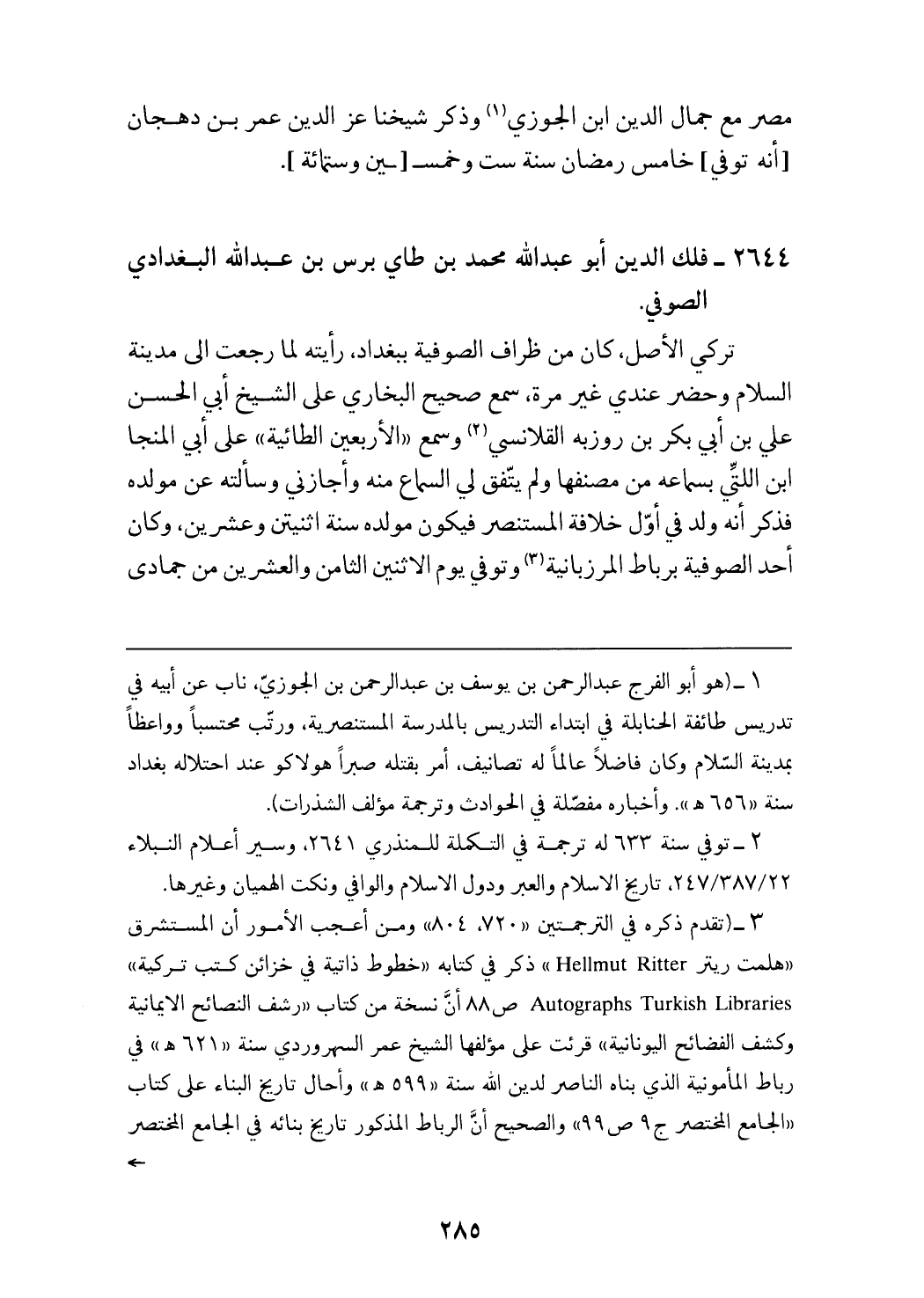 (¬3) (تقدم ذكره في الترجمتين «720، 804» ومن أعجب الأمور أن المستشرق هلمت ريتر Hellmut Ritter ذكر في كتابه «خطوط ذاتية في خزائن كتب تركية» Autographs Turkish Libraries ص 88 أنّ نسخة من كتاب «رشف النصائح الايمانية وكشف الفضائح اليونانية» قرئت على مؤلفها الشيخ عمر السهروردي سنة «621 هـ» في رباط المأمونية الذي بناه الناصر لدين الله سنة «599 هـ» وأحال تاريخ البناء على كتاب «الجامع المختصر ج 9 ص 99» والصحيح أنّ الرباط المذكور تاريخ بنائه في الجامع المختصر -