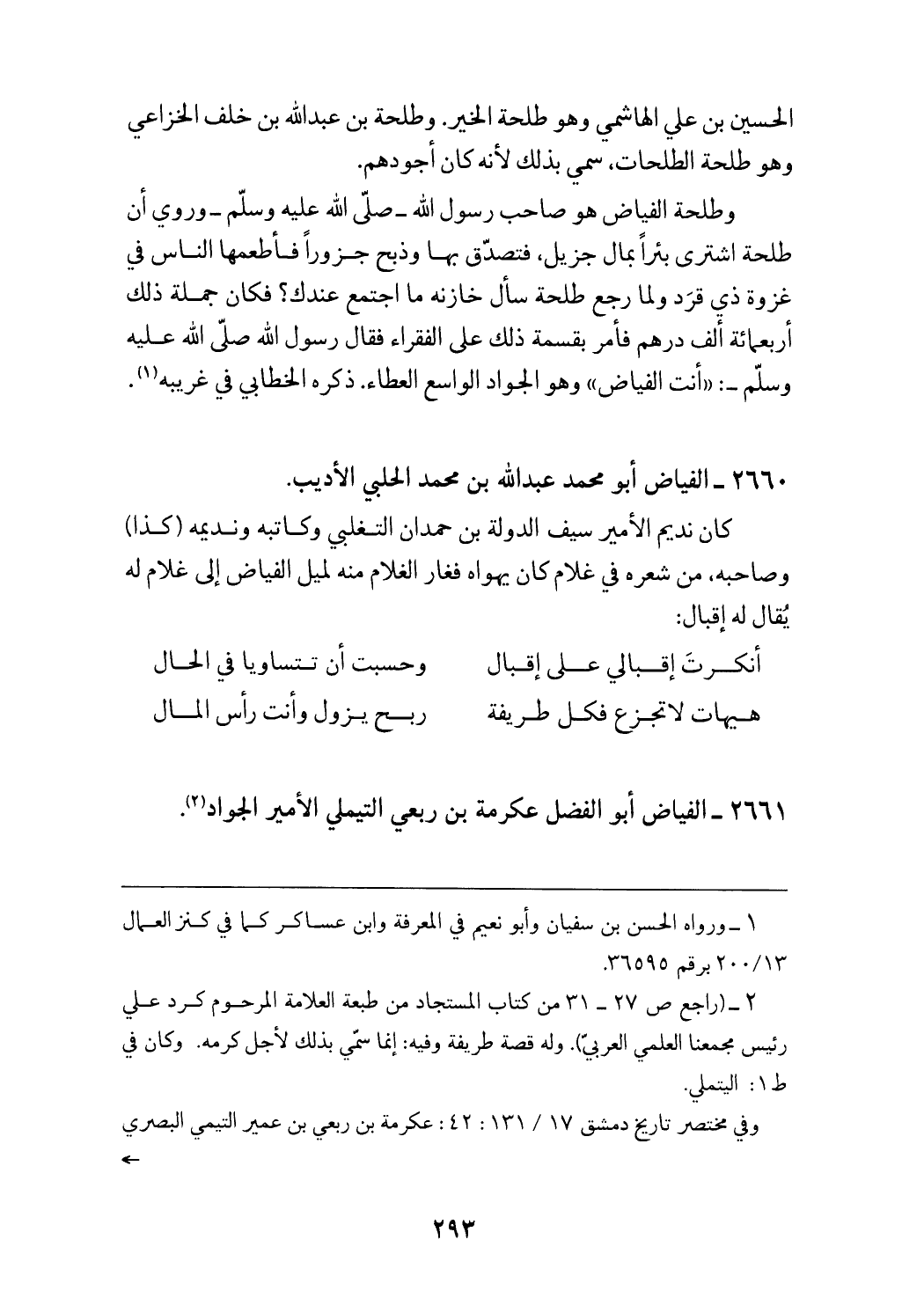(¬2) (راجع ص 27 - 31 من كتاب المستجاد من طبعة العلامة المرحوم كرد علي رئيس مجمعنا العلمي العربيّ). وله قصة طريفة وفيه: إنما سمّي بذلك لأجل كرمه. وكان في ط 1: اليتملي. وفي مختصر تاريخ دمشق 131/ 17: 42: عكرمة بن ربعي بن عمير التيمي البصري -
