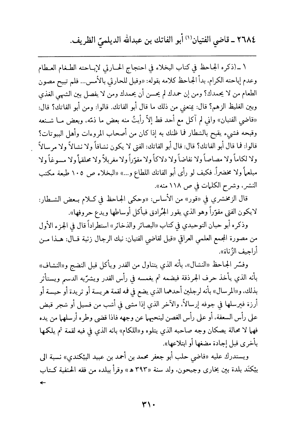 (¬1) (ذكره الجاحظ في كتاب البخلاء في احتجاج الحارثي لإباحته الطغام العطام وعدم إباحته الكرام، بدأ الجاحظ كلامه بقوله: «وقيل للحارثي بالأمس ... فلم تبيح مصون الطعام من لا يحمدك؟ ومن إن حمدك لم يحسن أن يحمدك ومن لا يفصل بين الشهي الغذي وبين الغليظ الزهم؟ قال: يمنعني من ذلك ما قال أبو الفاتك. قالوا: ومن أبو الفاتك؟ قال: «قاضي الفتيان» واني لم آكل مع أحد قط إلاّ رأيت منه بعض ما ذمّه، وبعض ما شنعه وقبحه فشيء يقبح بالشطار فما ظنك به إذا كان من أصحاب المروءات وأهل البيوتات؟ قالوا: فما قال أبو الفاتك؟ قال: قال أبو الفاتك: الفتى لا يكون نشافا ولا نشالا ولا مرسالا ولا لكاما ولا مصاصا ولا نفاضا ولا دلاكا ولا مقوّرا ولا مغربلا ولا محلقما ولا مسوغا ولا مبلعما ولا مخضرا. فكيف لو رأى أبو الفاتك اللطاع و ...» «البخلاء ص 105 طبعة مكتب النشر، وشرح الكلمات في ص 118 منه». قال الزمخشري في «قور» من الأساس: «وحكى الجاحظ في كلام بعض الشطار: لا يكون الفتى مقوّرا وهو الذي يقور الجرادق فيأكل أوساطها ويدع حروفها». وذكره أبو حيان التوحيدي في كتاب «البصائر والذخائر» استطرادا قال في الجزء الأول من مصورة المجمع العلمي العراقي «قيل لقاضي الفتيان: نيك الرجال زنية قال: هذا من أراجيف الزناة». وفسّر الجاحظ «النشال»، بأنه الذي يتناول من القدر ويأكل قبل النضج و «النشاف» بأنه الذي يأخذ حرف الجرذقة فيضمه ثم يغمسه في رأس القدر ويشرّبه الدسم ويستأثر بذلك، و «المرسال» بأنه لرجلين أحدهما الذي يضع في فمه لقمة هريسة أو ثريدة أو حيسة أو أرزة فيرسلها في جوفه إرسالا، والآخر الذي إذا مشى في أشب من فسيل أو شجر قبض على رأس السعفة، أو على رأس الغصن لينحيهما عن وجهه فاذا قضى وطره أرسلهما من يده فهما لا محالة يصكان وجه صاحبه الذي يتلوه و «اللكام» بانه الذي في فيه لقمة ثم يلكمها بأخرى قبل إجادة مضغها أو ابتلاعها». ويستدرك عليه «قاضي حلب أبو جعفر محمد بن أحمد بن عبيد البيكندي» نسبة الى بيكند بلدة بين بخارى وجيحون، ولد سنة «393 هـ» وقرأ ببلده من فقه الحنفية كتاب -