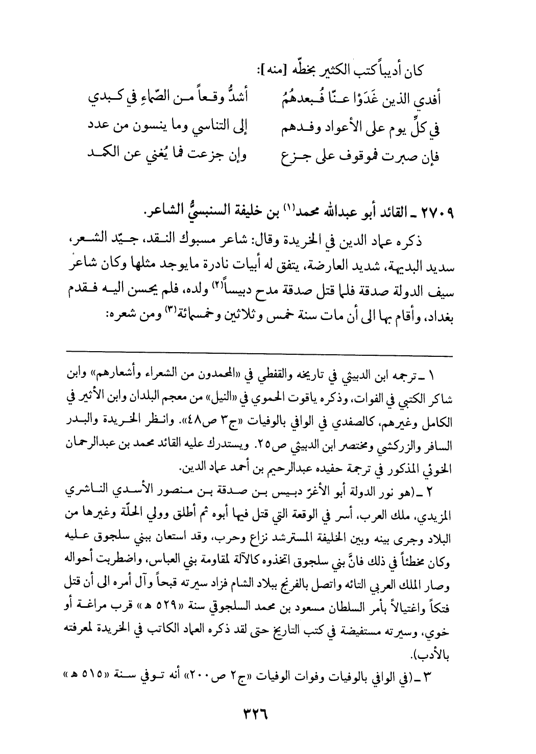 (¬2) (هو نور الدولة أبو الأغرّ دبيس بن صدقة بن منصور الأسدي الناشري المزيدي، ملك العرب، أسر في الوقعة التي قتل فيها أبوه ثم أطلق وولي الحلّة وغيرها من البلاد وجرى بينه وبين الخليفة المسترشد نزاع وحرب، وقد استعان ببني سلجوق عليه وكان مخطئا في ذلك فانّ بني سلجوق اتخذوه كالآلة لمقاومة بني العباس، واضطربت أحواله وصار الملك العربي التائه واتصل بالفرنج ببلاد الشام فزاد سيرته قبحا وآل أمره الى أن قتل فتكا واغتيالا بأمر السلطان مسعود بن محمد السلجوقي سنة «529 هـ» قرب مراغة أو خوي، وسيرته مستفيضة في كتب التاريخ حتى لقد ذكره العماد الكاتب في الخريدة لمعرفته بالأدب).