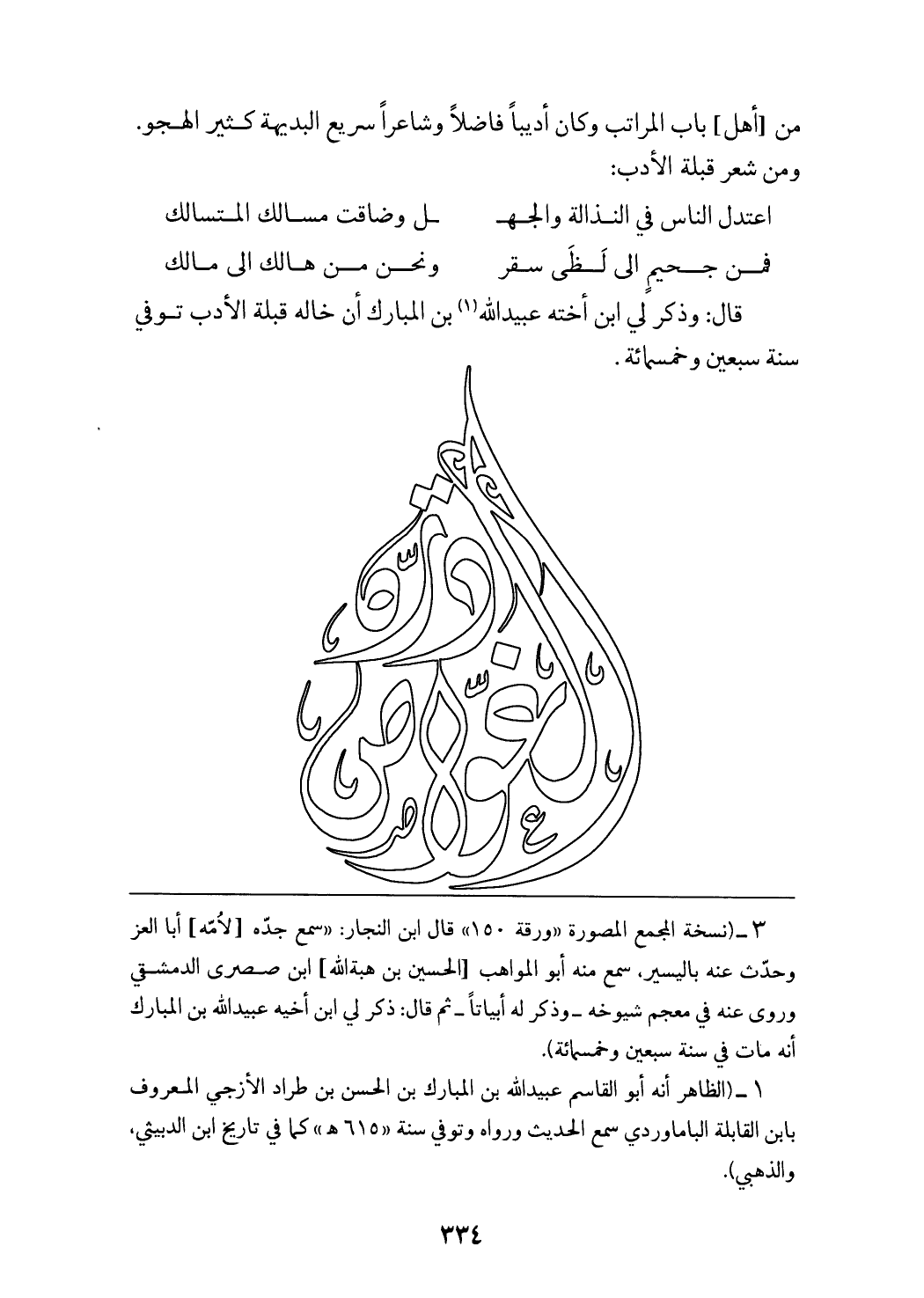 (¬1) (الظاهر أنه أبو القاسم عبيد الله بن المبارك بن الحسن بن طراد الأزجي المعروف بابن القابلة الباماوردي سمع الحديث ورواه وتوفي سنة «615 هـ» كما في تاريخ ابن الدبيثي، والذهبي).
