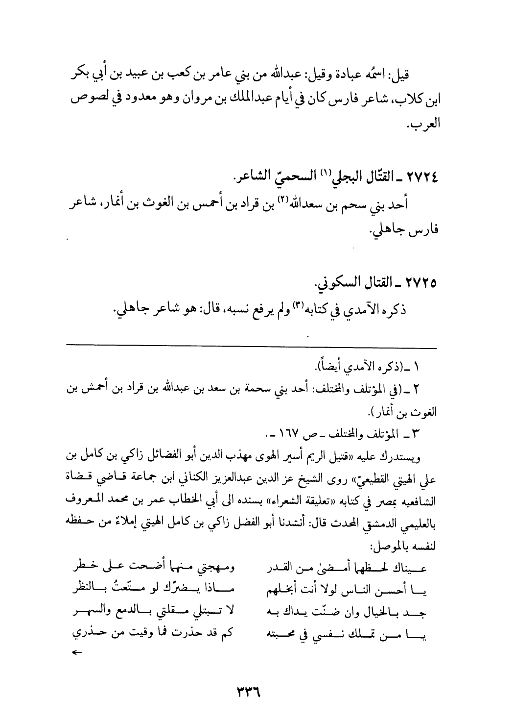 (¬3) المؤتلف والمختلف - ص 167 - . ويستدرك عليه «قتيل الريم أسير الهوى مهذب الدين أبو الفضائل زاكي بن كامل بن علي الهيتي القطيعيّ» روى الشيخ عزّ الدين عبد العزيز الكناني ابن جماعة قاضي قضاة الشافعية بمصر في كتابه «تعليقة الشعراء» بسنده الى أبي الخطاب عمر بن محمد المعروف بالعليمي الدمشقي المحدث قال: أنشدنا أبو الفضل زاكي بن كامل الهيتي إملاء من حفظه لنفسه بالموصل: