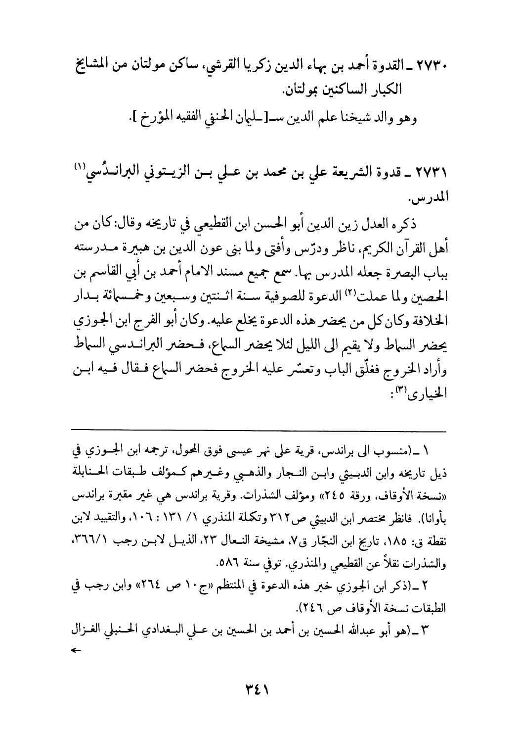 (¬1) (منسوب الى براندس، قرية على نهر عيسى فوق المحول، ترجمه ابن الجوزي في ذيل تاريخه وابن الدبيثي وابن النجار والذهبي وغيرهم كمؤلف طبقات الحنابلة «نسخة الأوقاف، ورقة 245» ومؤلف الشذرات. وقرية براندس هي غير مقبرة براندس بأوانا). فانظر مختصر ابن الدبيثي ص 312 وتكملة المنذري 131/ 1: 106، والتقييد لابن نقطة ق: 185، تاريخ ابن النجّار ق 7، مشيخة النعال 23، الذيل لابن رجب 366/ 1، والشذرات نقلا عن القطيعي والمنذري. توفي سنة 586.
