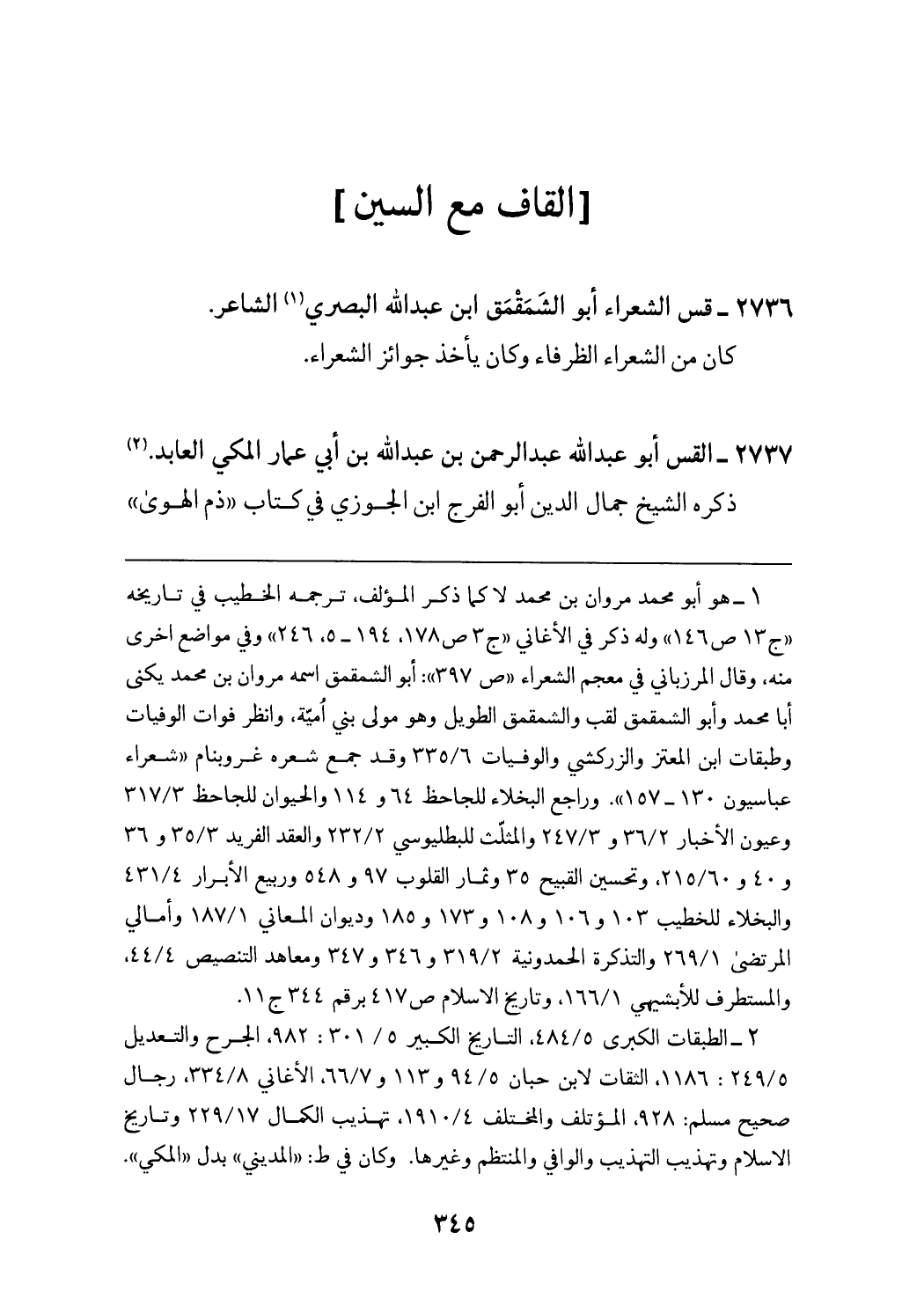 (¬1) هو أبو محمد مروان بن محمد لا كما ذكر المؤلف، ترجمه الخطيب في تاريخه «ج 13 ص 146» وله ذكر في الأغاني «ج 3 ص 178، 194 - 5، 246» وفي مواضع اخرى منه، وقال المرزباني في معجم الشعراء «ص 397»: أبو الشمقمق اسمه مروان بن محمد يكنى أبا محمد وأبو الشمقمق لقب والشمقمق الطويل وهو مولى بني اميّة، وانظر فوات الوفيات وطبقات ابن المعتز والزركشي والوفيات 335/ 6 وقد جمع شعره غرونباوم «شعراء عباسيون 130 - 157».وراجع البخلاء للجاحظ 64 و 114 والحيوان للجاحظ 317/ 3 وعيون الأخبار 36/ 2 و 247/ 3 والمثلّث للبطليوسي 232/ 2 والعقد الفريد 35/ 3 و 36 و 40 و 215/ 60، وتحسين القبيح 35 وثمار القلوب 97 و 548 وربيع الأبرار 431/ 4 والبخلاء للخطيب 103 و 106 و 108 و 173 و 185 وديوان المعاني 187/ 1 وأمالي المرتضى 269/ 1 والتذكرة الحمدونية 319/ 2 و 346 و 347 ومعاهد التنصيص 44/ 4، والمستطرف للأبشيهي 166/ 1، وتاريخ الاسلام ص 417 برقم 344 ج 11.