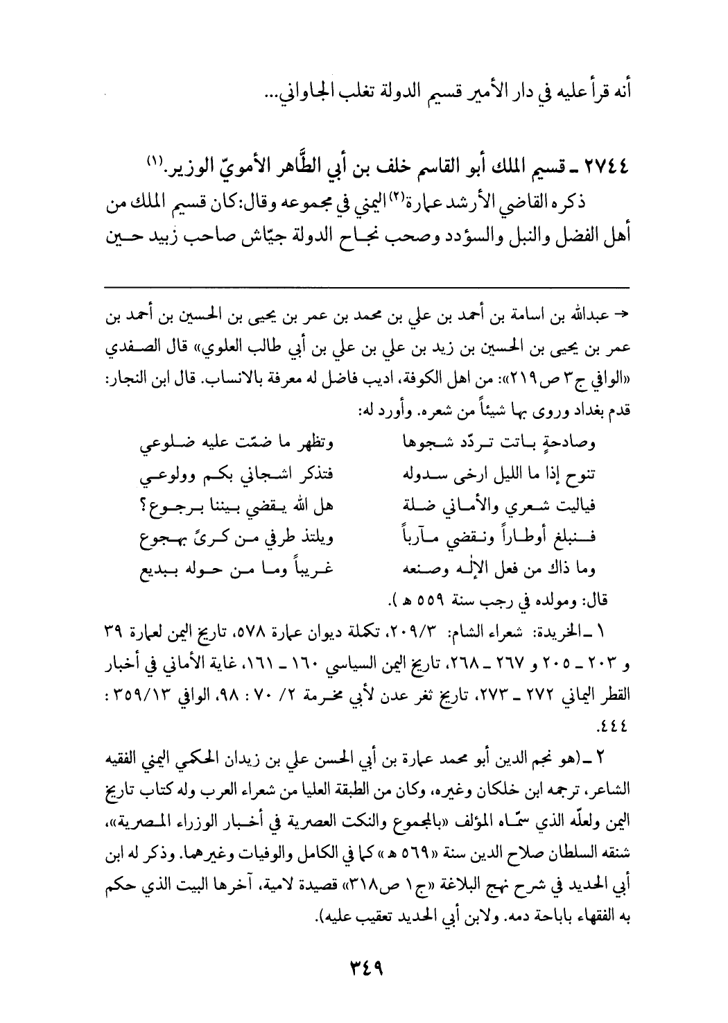(¬2) (هو نجم الدين أبو محمد عمارة بن أبي الحسن علي بن زيدان الحكمي اليمني الفقيه الشاعر، ترجمه ابن خلكان وغيره، وكان من الطبقة العليا من شعراء العرب وله كتاب تاريخ اليمن ولعلّه الذي سمّاه المؤلف «بالمجموع والنكت العصرية في أخبار الوزراء المصرية»، شنقه السلطان صلاح الدين سنة «569 هـ» كما في الكامل والوفيات وغيرهما. وذكر له ابن أبي الحديد في شرح نهج البلاغة «ج 1 ص 318» قصيدة لامية، آخرها البيت الذي حكم به الفقهاء باباحة دمه. ولابن أبي الحديد تعقيب عليه).