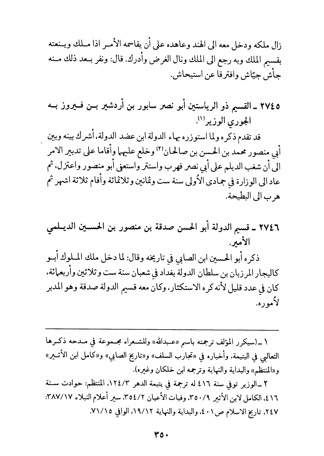 (¬2) الوزير توفي سنة 416 له ترجمة في يتيمة الدهر 124/ 3، المنتظم: حوادث سنة 416، الكامل لابن الأثير 350/ 9، وفيات الأعيان 354/ 2، سير أعلام النبلاء 387/ 17: 247، تاريخ الاسلام ص 401، والبداية والنهاية 19/ 12، الوافي 71/ 15.