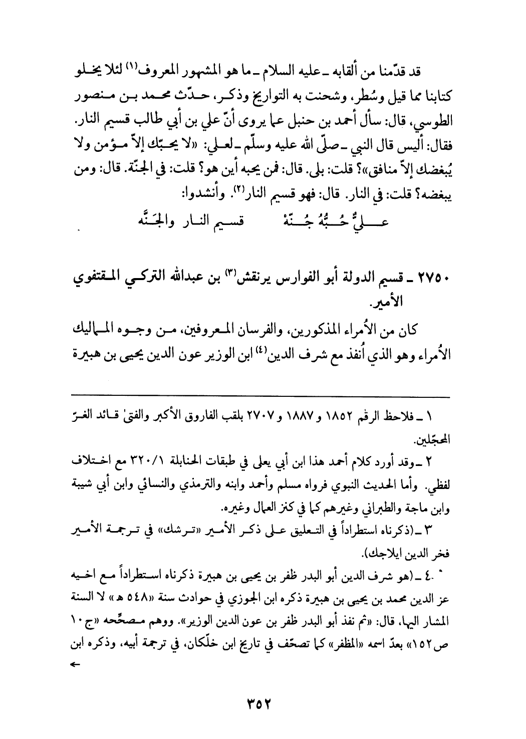 (¬4) (هو شرف الدين أبو البدر ظفر بن يحيى بن هبيرة ذكرناه استطرادا مع اخيه عزّ الدين محمد بن يحيى بن هبيرة ذكره ابن الجوزي في حوادث سنة «548 هـ» لا السنة المشار اليها، قال: «ثم نفذ أبو البدر ظفر بن عون الدين الوزير».وو هم مصحّحة «ج 10 ص 152» بعدّ اسمه «المظفر» كما تصحّف في تاريخ ابن خلّكان، في ترجمة أبيه، وذكره ابن -