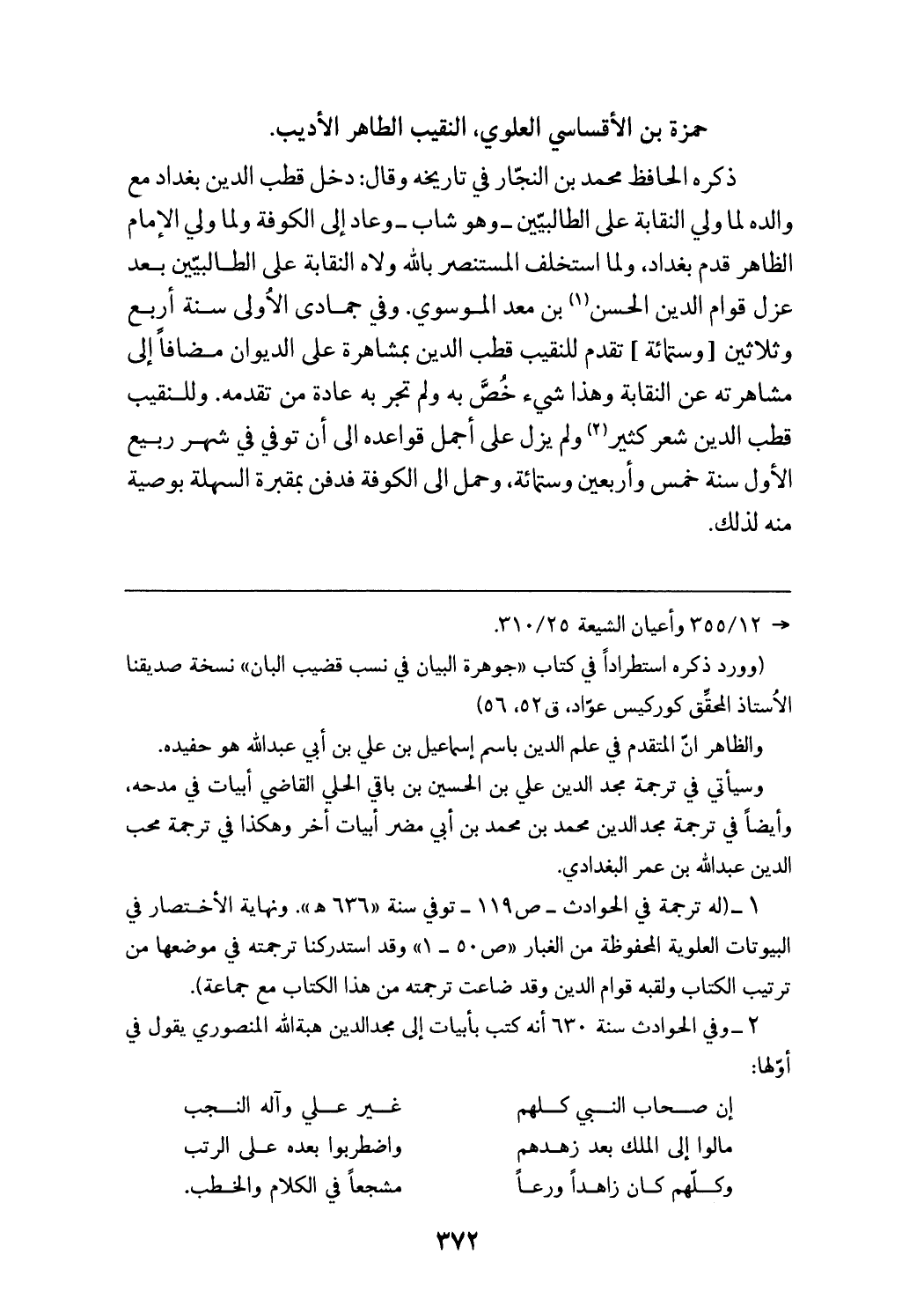 (¬1) (له ترجمة في الحوادث - ص 119 - توفي سنة «636 هـ».ونهاية الاختصار في البيوتات العلوية المحفوظة من الغبار «ص 50 - 1» وقد استدركنا ترجمته في موضعها من ترتيب الكتاب ولقبه قوام الدين وقد ضاعت ترجمته من هذا الكتاب مع جماعة).