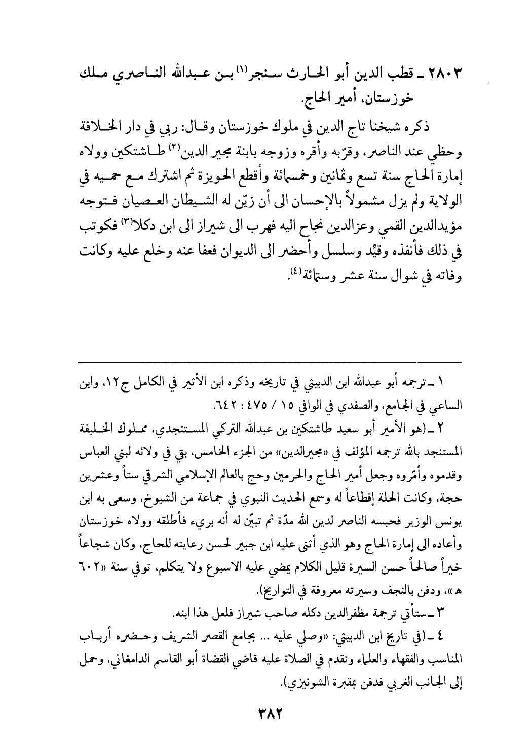 (¬2) (هو الأمير أبو سعيد طاشتكين بن عبد الله التركي المستنجدي، مملوك الخليفة المستنجد با لله ترجمه المؤلف في «مجير الدين» من الجزء الخامس، بقي في ولائه لبني العباس وقدموه وأمّروه وجعل أمير الحاج والحرمين وحج بالعالم الإسلامي الشرقي ستا وعشرين حجة، وكانت الحلة إقطاعا له وسمع الحديث النبوي في جماعة من الشيوخ، وسعى به ابن يونس الوزير فحبسه الناصر لدين الله مدّة ثم تبيّن له أنه بريء فأطلقه وولاه خوزستان وأعاده الى إمارة الحاج وهو الذي أثنى عليه ابن جبير لحسن رعايته للحاج، وكان شجاعا خيرا صالحا حسن السيرة قليل الكلام يمضي عليه الاسبوع ولا يتكلم، توفي سنة «602 هـ»، ودفن بالنجف وسيرته معروفة في التواريخ).