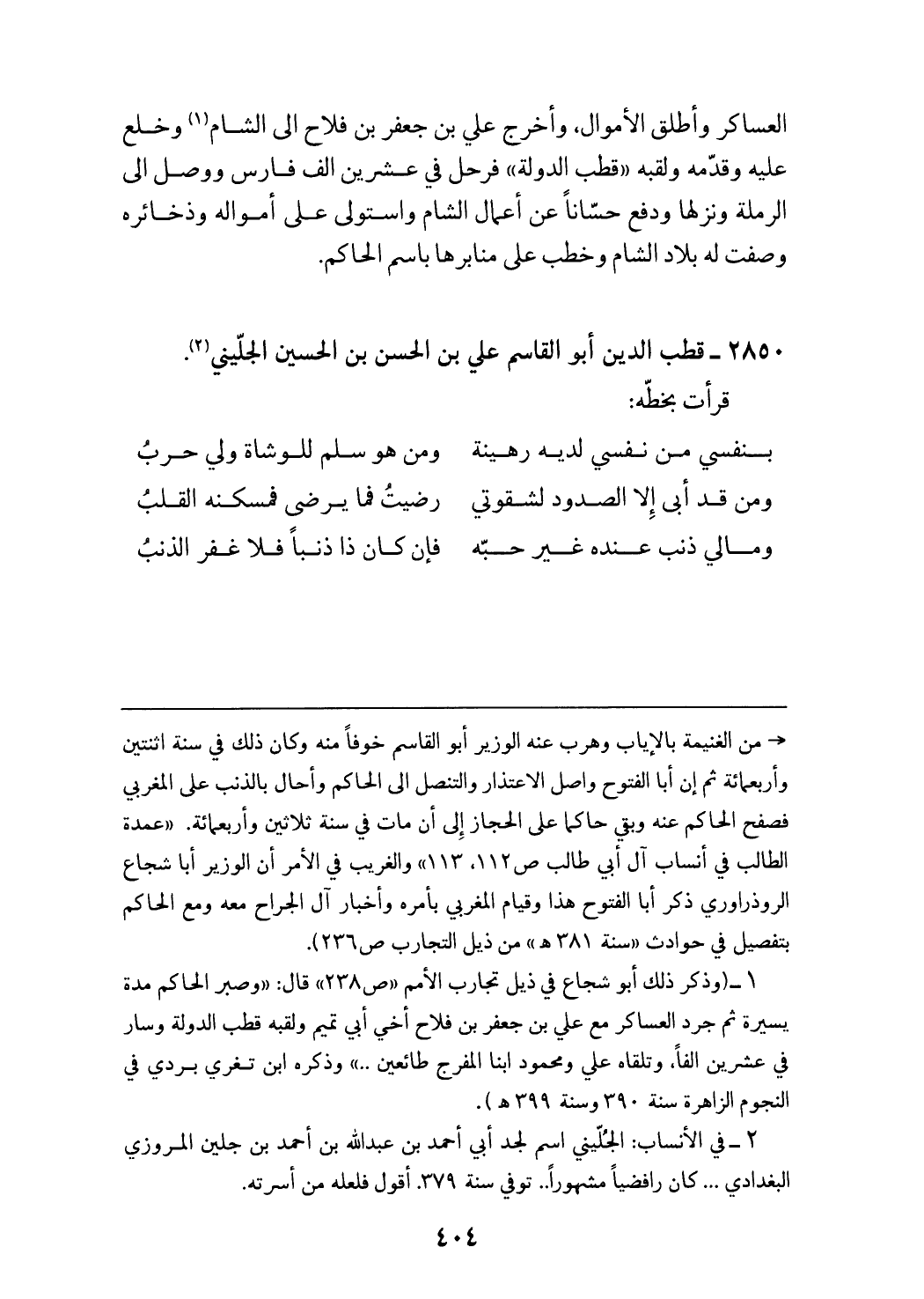 (¬1) (وذكر ذلك أبو شجاع في ذيل تجارب الأمم «ص 238» قال: «وصبر الحاكم مدة يسيرة ثم جرد العساكر مع علي بن جعفر بن فلاح أخي أبي تميم ولقبه قطب الدولة وسار في عشرين الفا، وتلقاه علي ومحمود ابنا المفرج طائعين ..» وذكره ابن تغري بردي في النجوم الزاهرة سنة 390 وسنة 399 هـ).