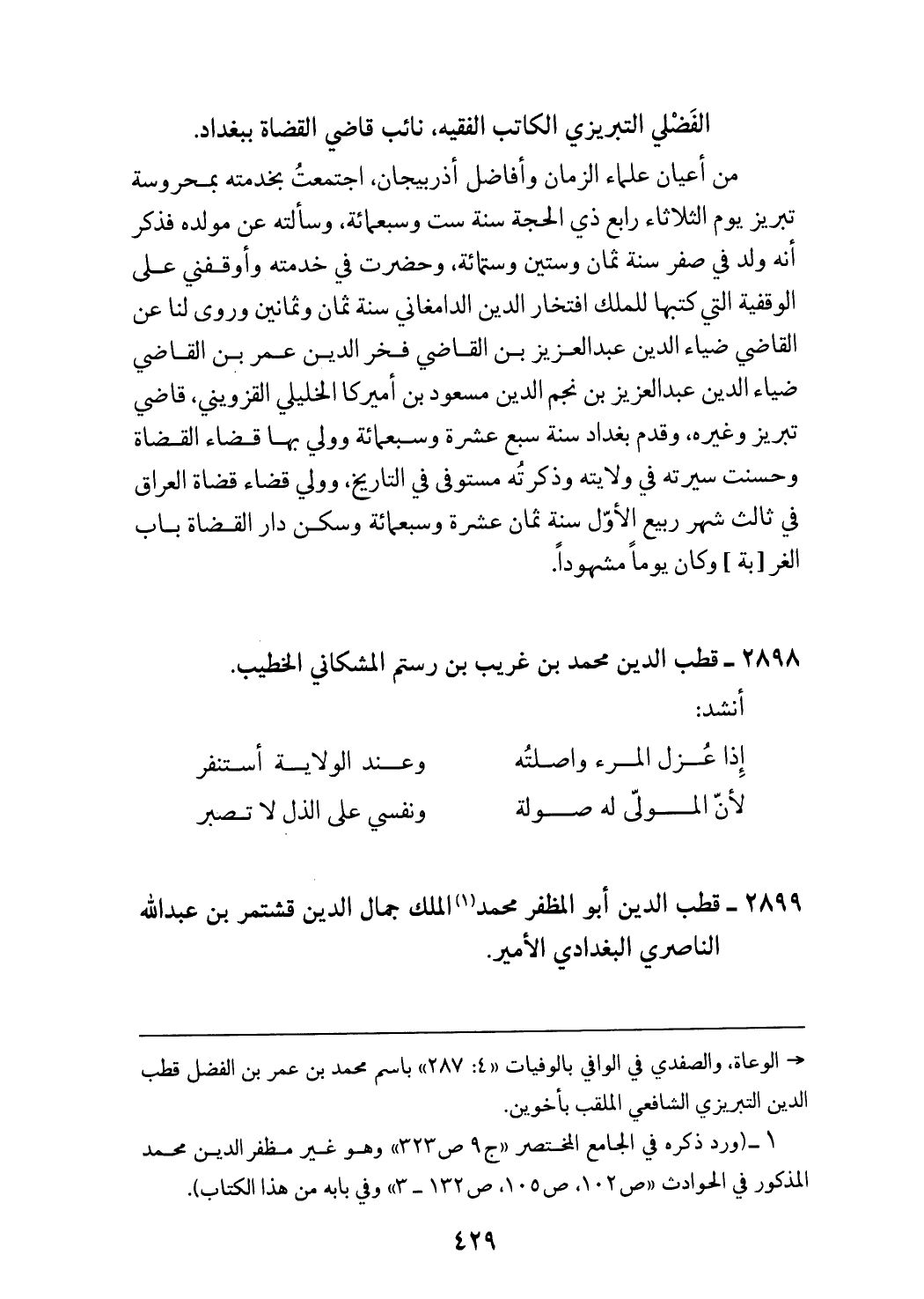 - الوعاة، والصفدي في الوافي بالوفيات «4: 287» باسم محمد بن عمر بن الفضل قطب الدين التبريزي الشافعي الملقب بأخوين.