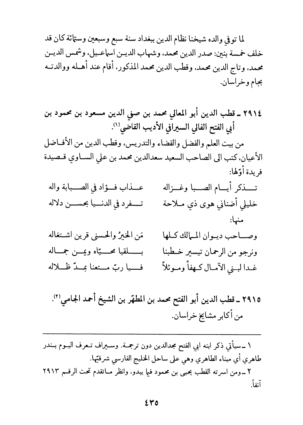 (¬1) سيأتي ذكر ابنه ابي الفتح مجد الدين دون ترجمة. وسيراف تعرف اليوم بندر طاهري أي ميناء الطاهري وهي على ساحل الخليج الفارسي شرقيّها.