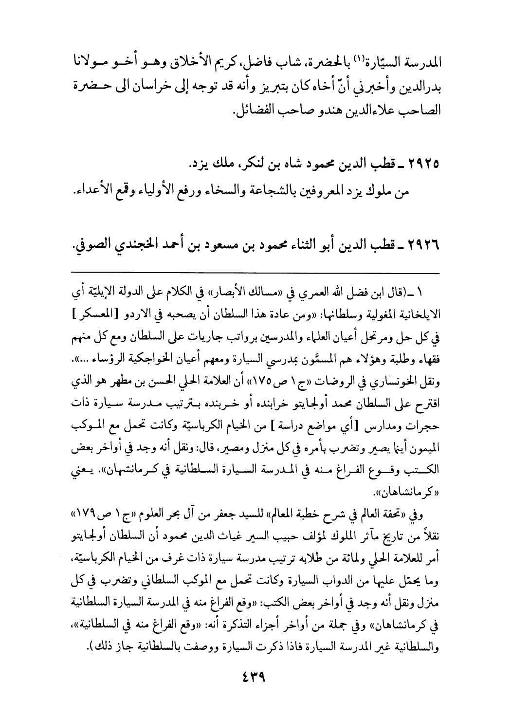 (¬1) (قال ابن فضل الله العمري في «مسالك الأبصار» في الكلام على الدولة الإيليّة أي الايلخانية المغولية وسلطانها: «ومن عادة هذا السلطان أن يصحبه في الاردو [المعسكر] في كل حل ومرتحل أعيان العلماء والمدرسين برواتب جاريات على السلطان ومع كل منهم فقهاء وطلبة وهؤلاء هم المسمّون بمدرسي السيارة ومعهم أعيان الخواجكية الرؤساء ...». ونقل الخونساري في الروضات «ج 1 ص 175» أن العلامة الحلي الحسن بن مطهر هو الذي اقترح على السلطان محمد أولجايتو خرابنده أو خربنده بترتيب مدرسة سيارة ذات حجرات ومدارس [أي مواضع دراسة] من الخيام الكرباسيّة وكانت تحمل مع الموكب الميمون أينما يصير وتضرب بأمره في كل منزل ومصير، قال: ونقل أنه وجد في أواخر بعض الكتب وقوع الفراغ منه في المدرسة السيارة السلطانية في كرمانشهان».يعني «كرمانشاهان». وفي «تحفة العالم في شرح خطبة المعالم» للسيد جعفر من آل بحر العلوم «ج 1 ص 179» نقلا من تاريخ مآثر الملوك لمؤلف حبيب السير غياث الدين محمود أن السلطان أولجايتو أمر للعلامة الحلي ولمائة من طلابه ترتيب مدرسة سيارة ذات غرف من الخيام الكرباسيّة، وما يحمّل عليها من الدواب السيارة وكانت تحمل مع الموكب السلطاني وتضرب في كل منزل ونقل أنه وجد في أواخر بعض الكتب: «وقع الفراغ منه في المدرسة السيارة السلطانية في كرمانشاهان» وفي جملة من أواخر أجزاء التذكرة أنه: «وقع الفراغ منه في السلطانية»، والسلطانية غير المدرسة السيارة فاذا ذكرت السيارة ووصفت بالسلطانية جاز ذلك).