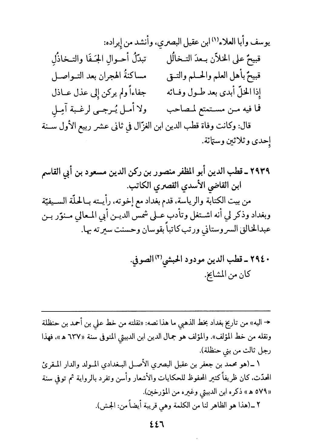 = اليه» من تاريخ بغداد بخط الذهبي ما هذا نصه: «نقلته من خط علي بن أحمد بن حنظلة ونقله من خط المؤلف».والمؤلف هو جمال الدين ابن الدبيثي المتوفى سنة «637 هـ»، فهذا رجل ثالث من بني حنظلة).