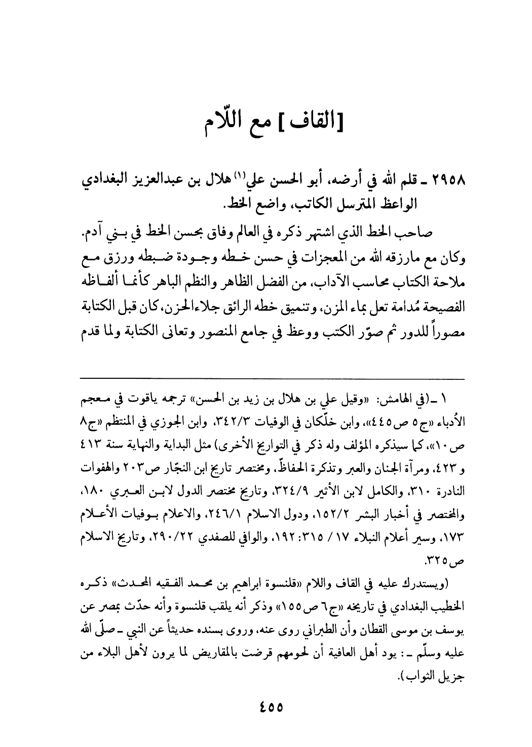 (¬1) (في الهامش: «وقيل علي بن هلال بن زيد بن الحسن» ترجمه ياقوت في معجم الادباء «ج 5 ص 445»، وابن خلّكان في الوفيات 342/ 3، وابن الجوزي في المنتظم «ج 8 ص 10»، كما سيذكره المؤلف وله ذكر في التواريخ الأخرى) مثل البداية والنهاية سنة 413 و 423، ومرآة الجنان والعبر وتذكرة الحفاظ، ومختصر تاريخ ابن النجّار ص 203 والهفوات النادرة 310، والكامل لابن الأثير 324/ 9، وتاريخ مختصر الدول لابن العبري 180، والمختصر في أخبار البشر 152/ 2، ودول الاسلام 246/ 1، والاعلام بوفيات الأعلام 173، وسير أعلام النبلاء 315/ 17: 192، والوافي للصفدي 290/ 22، وتاريخ الاسلام ص 325. (ويستدرك عليه في القاف واللام «قلنسوة ابراهيم بن محمد الفقيه المحدث» ذكره الخطيب البغدادي في تاريخه «ج 6 ص 155» وذكر أنه يلقب قلنسوة وأنه حدّث بمصر عن يوسف بن موسى القطان وأن الطبراني روى عنه، وروى بسنده حديثا عن النبي - صلّى الله عليه وسلّم -: يود أهل العافية أن لحومهم قرضت بالمقاريض لما يرون لأهل البلاء من جزيل الثواب).