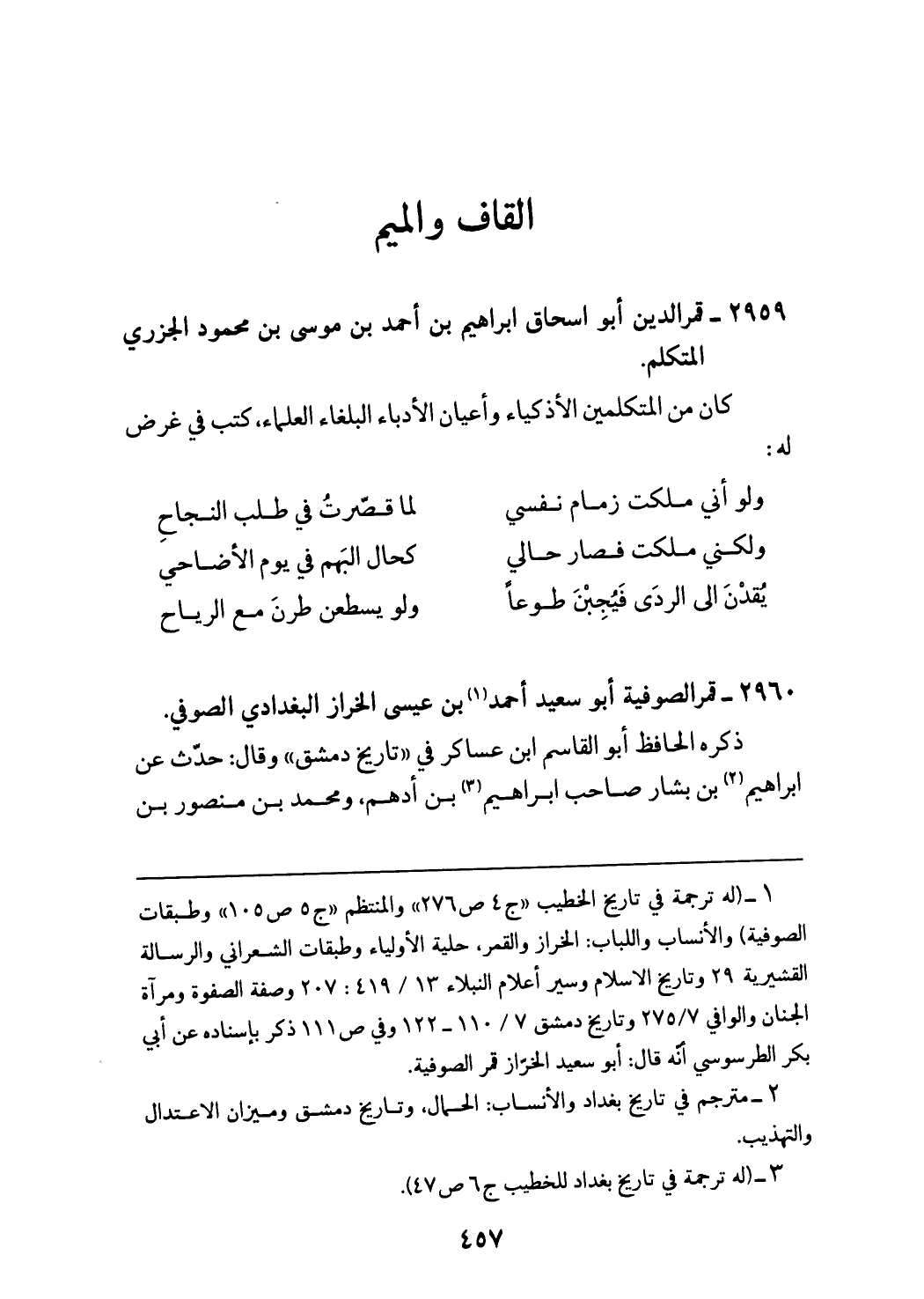 (¬1) (له ترجمة في تاريخ الخطيب «ج 4 ص 276» والمنتظم «ج 5 ص 105» وطبقات الصوفية) والأنساب واللباب: الخراز والقمر، حلية الأولياء وطبقات الشعراني والرسالة القشيرية 29 وتاريخ الاسلام وسير أعلام النبلاء 419/ 13: 207 وصفة الصفوة ومرآة الجنان والوافي 275/ 7 وتاريخ دمشق 110/ 7 - 122 وفي ص 111 ذكر بإسناده عن أبي بكر الطرسوسي أنّه قال: أبو سعيد الخرّاز قمر الصوفية.
