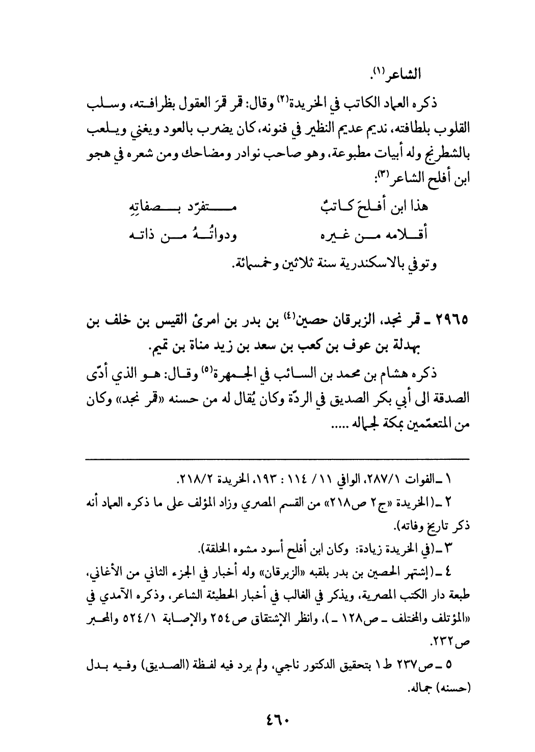 (¬4) (اشتهر الحصين بن بدر بلقبه «الزبرقان» وله أخبار في الجزء الثاني من الأغاني، طبعة دار الكتب المصرية، ويذكر في الغالب في أخبار الحطيئة الشاعر، وذكره الآمدي في «المؤتلف والمختلف - ص 128 -)، وانظر الاشتقاق ص 254 والإصابة 524/ 1 والمحبر ص 232.