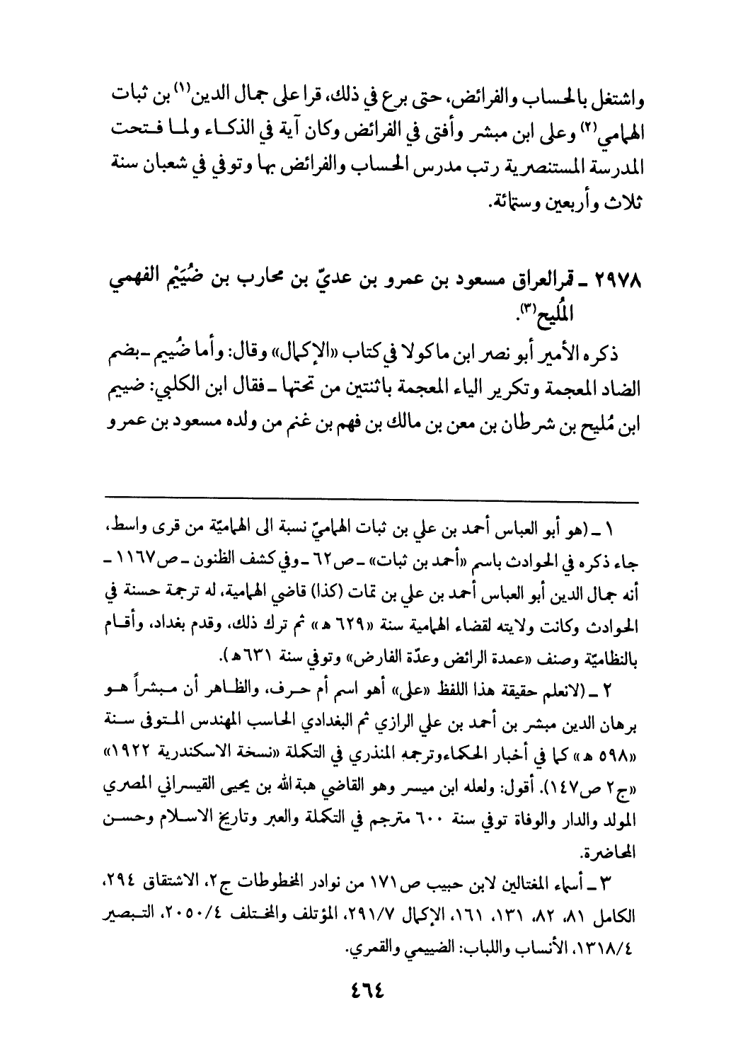 (¬2) (لا نعلم حقيقة هذا اللفظ «على» أهو اسم أم حرف، والظاهر أن مبشرا هو برهان الدين مبشر بن أحمد بن علي الرازي ثم البغدادي الحاسب المهندس المتوفى سنة «598 هـ» كما في أخبار الحكماء وترجمه المنذري في التكملة «نسخة الاسكندرية 1922» «ج 2 ص 147). أقول: ولعله ابن ميسر وهو القاضي هبة الله بن يحيى القيسراني المصري المولد والدار والوفاة توفي سنة 600 مترجم في التكملة والعبر وتاريخ الاسلام وحسن المحاضرة.