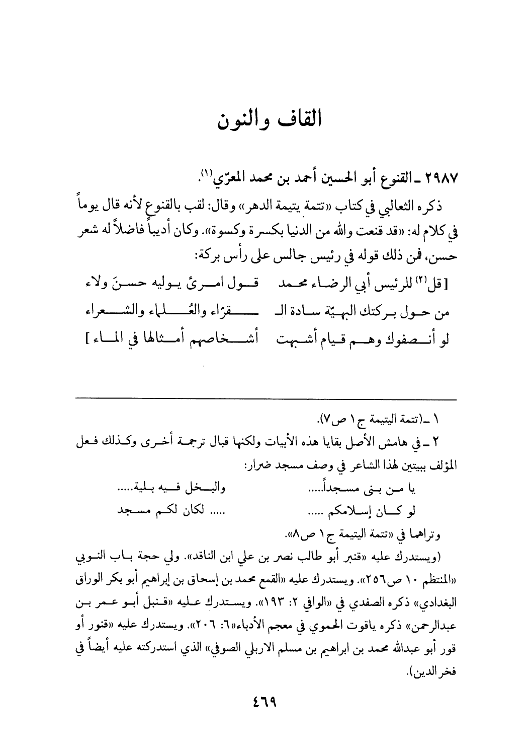 وتراهما في «تتمة اليتيمة ج 1 ص 8». (ويستدرك عليه «قنبر أبو طالب نصر بن علي ابن الناقد».ولي حجة باب النوبي «المنتظم 10 ص 256».ويستدرك عليه «القمع محمد بن إسحاق بن إبراهيم أبو بكر الوراق البغدادي» ذكره الصفدي في «الوافي 2: 193».ويستدرك عليه «قنبل أبو عمر بن عبد الرحمن» ذكره ياقوت الحموي في معجم الأدباء «6: 206».ويستدرك عليه «قنور أو قور أبو عبد الله محمد بن ابراهيم بن مسلم الاربلي الصوفي» الذي استدركته عليه أيضا في فخر الدين).
