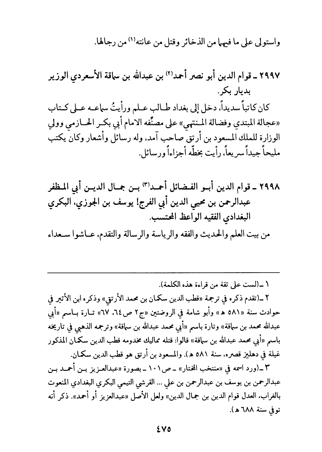 (¬3) (ورد اسمه في «منتخب المختار» - ص 101 - بصورة «عبد العزيز بن أحمد بن عبد الرحمن بن يوسف بن عبد الرحمن بن علي ... القرشي التيمي البكري البغدادي المنعوت بالغراب، العدل قوام الدين بن جمال الدين» ولعل الأصل «عبد العزيز أو أحمد».ذكر أنه توفي سنة 688 هـ).