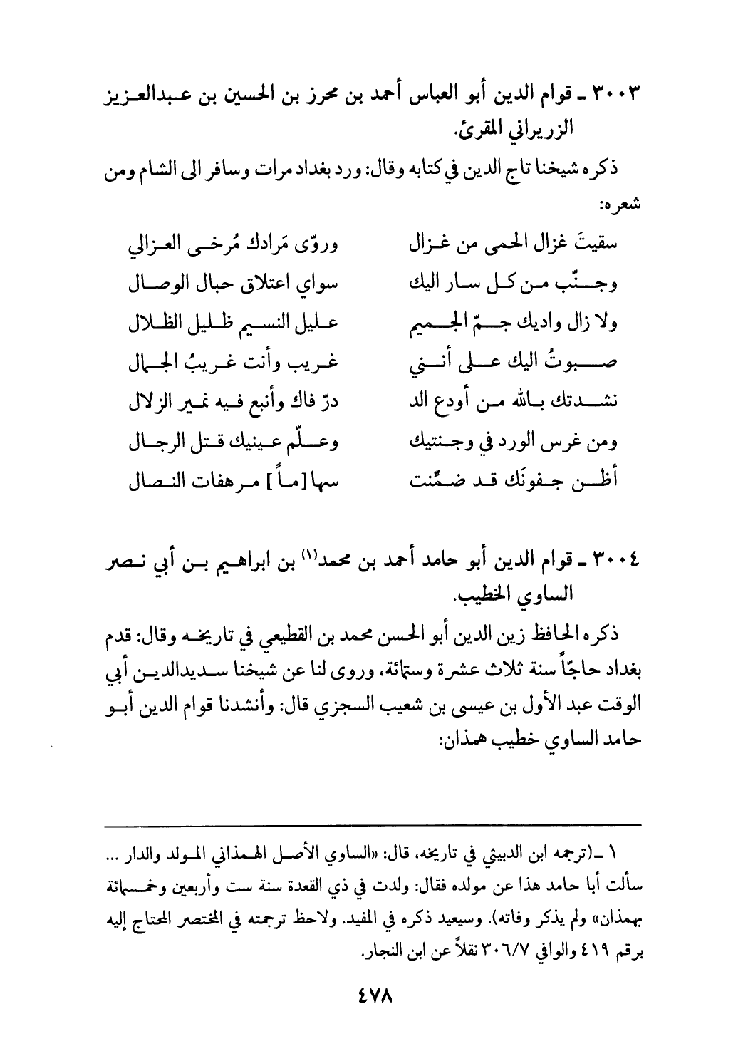 ذكره الحافظ زين الدين أبو الحسن محمد بن القطيعي في تاريخه وقال: قدم بغداد حاجّا سنة ثلاث عشرة وستمائة، وروى لنا عن شيخنا سديد الدين أبي الوقت عبد الأول بن عيسى بن شعيب السجزي قال: وأنشدنا قوام الدين أبو حامد الساوي خطيب همذان: