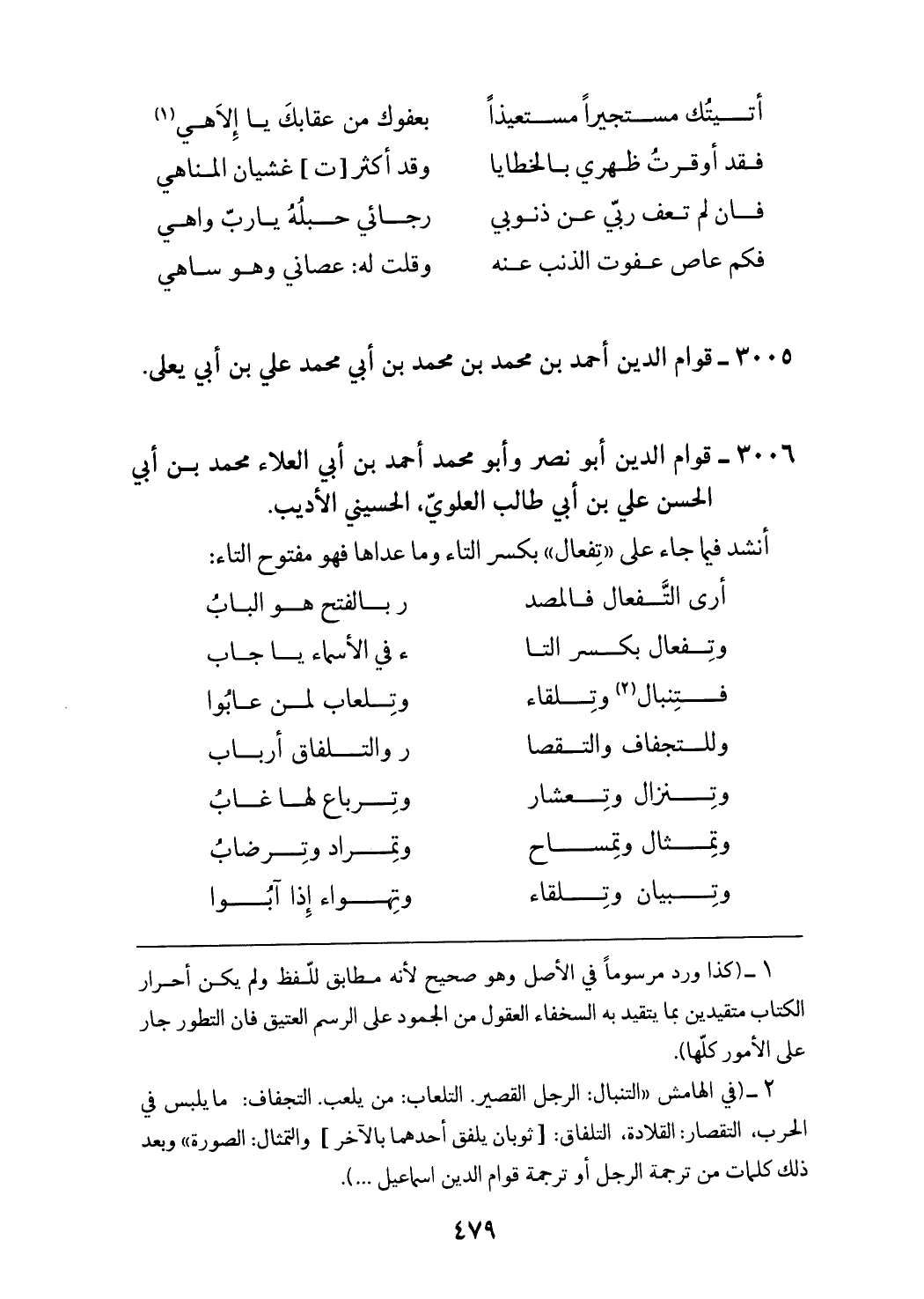 (¬2) (في الهامش «التنبال: الرجل القصير. التلعاب: من يلعب. التجفاف: ما يلبس في الحرب، التقصار: القلادة، التلفاق: [ثوبان يلفق أحدهما بالآخر] والتمثال: الصورة» وبعد ذلك كلمات من ترجمة الرجل أو ترجمة قوام الدين اسماعيل ...).