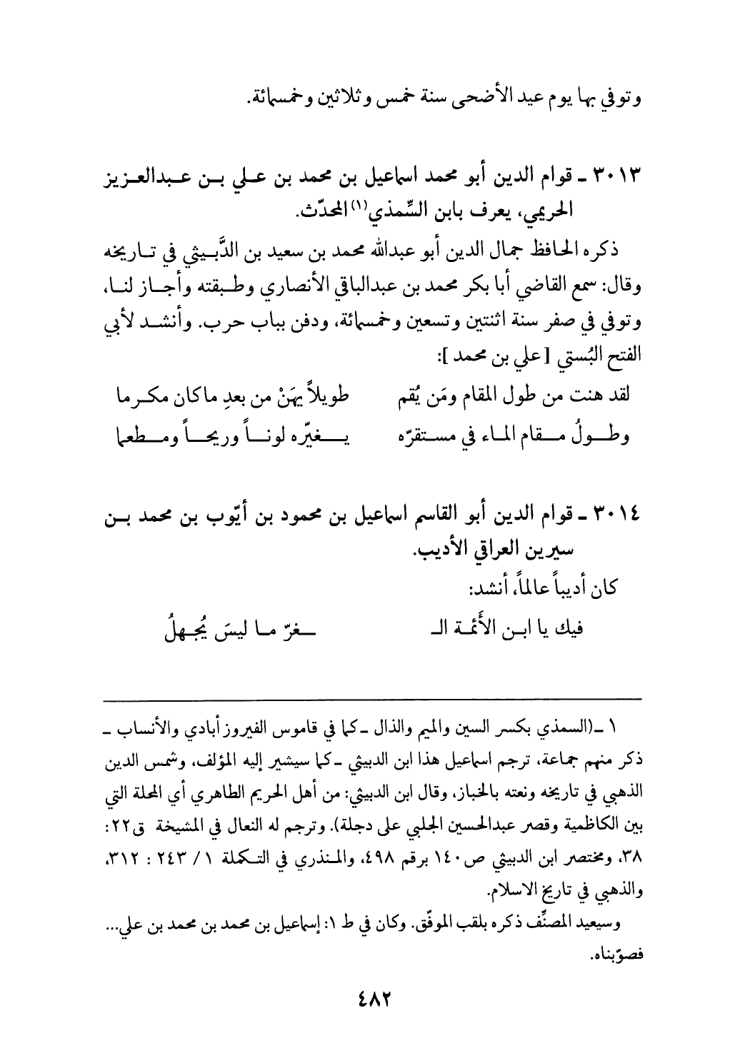 (¬1) (السمذي بكسر السين والميم والذال - كما في قاموس الفيروزأبادي والأنساب - ذكر منهم جماعة، ترجم اسماعيل هذا ابن الدبيثي - كما سيشير إليه المؤلف، وشمس الدين الذهبي في تاريخه ونعته بالخباز، وقال ابن الدبيثي: من أهل الحريم الطاهري أي المحلة التي بين الكاظمية وقصر عبد الحسين الجلبي على دجلة). وترجم له النعال في المشيخة ق 22: 38، ومختصر ابن الدبيثي ص 140 برقم 498، والمنذري في التكملة 243/ 1: 312، والذهبي في تاريخ الاسلام. وسيعيد المصنّف ذكره بلقب الموفّق، وكان في ط 1: إسماعيل بن محمد بن محمد بن علي ... فصوّبناه.