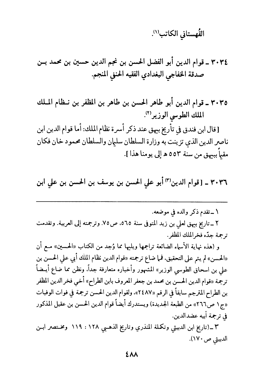 (¬2) تاريخ بيهق لعلي بن زيد المتوفى سنة 565، ص 75.وترجمته إلى العربية. وتقدمت ترجمة جدّه فخر الملك المظفر. و (هذه نهاية الأسماء الضائعة تراجمها ويليها مما وجد من الكتاب «الحسين» مع أن «الحسن» لم يتم على التحقيق، فمما ضاع ترجمته «قوام الدين نظام الملك أبي علي الحسن بن علي بن اسحاق الطوسي الوزير» المشهور وأخباره متعارفة جدا، ونظن مما ضاع أيضا ترجمة «قوام الدين الحسن بن محمد بن جعفر المعروف بابن الطراح» أخي فخر الدين المظفر بن الطراح المترجم سابقا في الرقم «2487»، ولقوام الدين الحسن ترجمة في فوات الوفيات «ج 1 ص 266» من الطبعة الجديدة) ويستدرك أيضا قوام الدين الحسن بن عقيل المذكور في ترجمة أبيه عضد الدين.