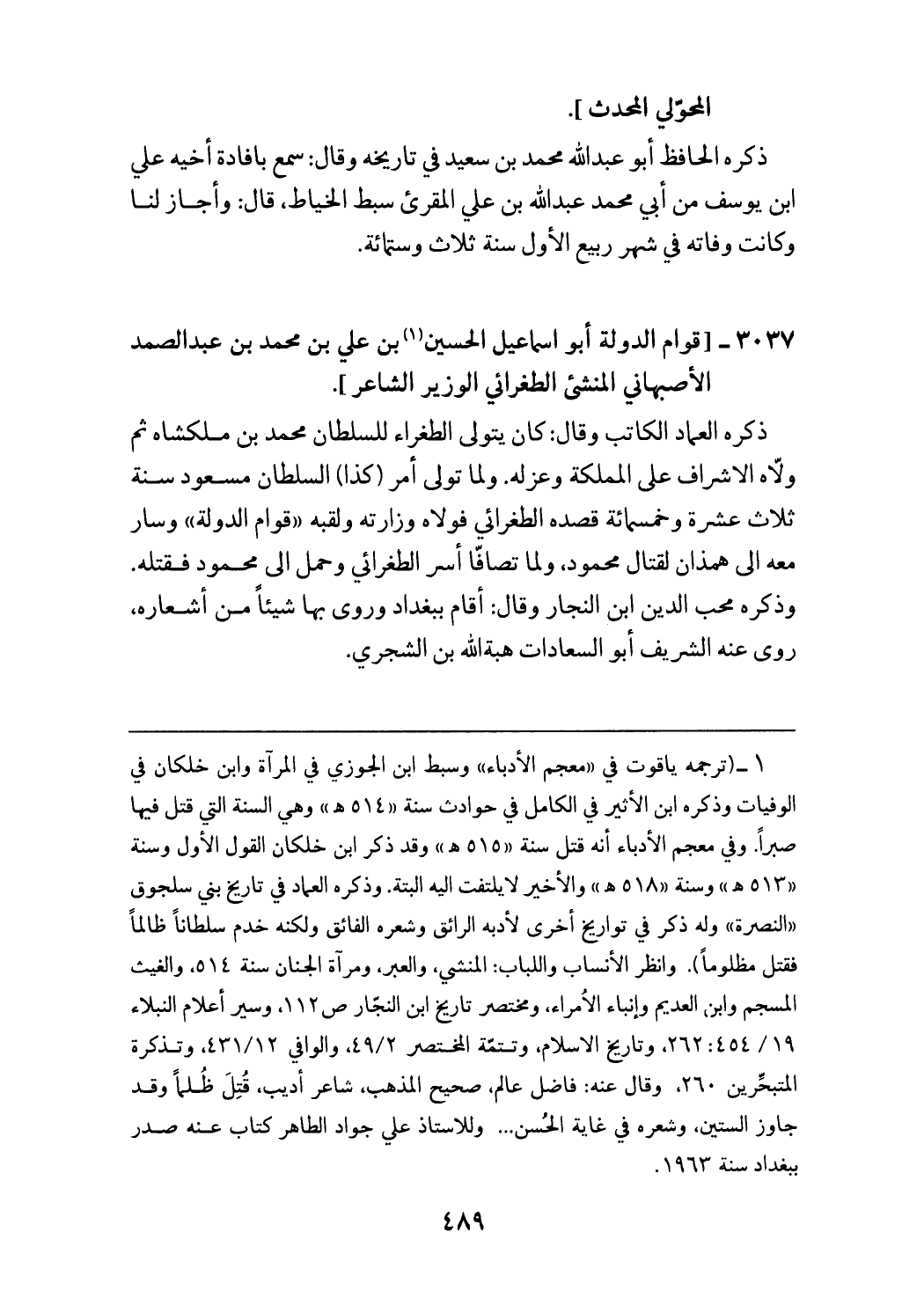 (¬1) (ترجمه ياقوت في «معجم الأدباء» وسبط ابن الجوزي في المرآة وابن خلكان في الوفيات وذكره ابن الأثير في الكامل في حوادث سنة «514 هـ» وهي السنة التي قتل فيها صبرا. وفي معجم الأدباء أنه قتل سنة «515 هـ» وقد ذكر ابن خلكان القول الأول وسنة «513 هـ» وسنة «518 هـ» والأخير لا يلتفت اليه البتة. وذكره العماد في تاريخ بني سلجوق «النصرة» وله ذكر في تواريخ أخرى لأدبه الرائق وشعره الفائق ولكنه خدم سلطانا ظالما فقتل مظلوما). وانظر الأنساب واللباب: المنشي، والعبر، ومرآة الجنان سنة 514، والغيث المسجم وابن العديم وإنباء الامراء، ومختصر تاريخ ابن النجّار ص 112، وسير أعلام النبلاء 454/ 19: 262، وتاريخ الاسلام، وتتمّة المختصر 49/ 2، والوافي 431/ 12، وتذكرة المتبحّرين 260، وقال عنه: فاضل عالم، صحيح المذهب، شاعر أديب، قتل ظلما وقد جاوز الستين، وشعره في غاية الحسن ... وللاستاذ علي جواد الطاهر كتاب عنه صدر ببغداد سنة 1963.