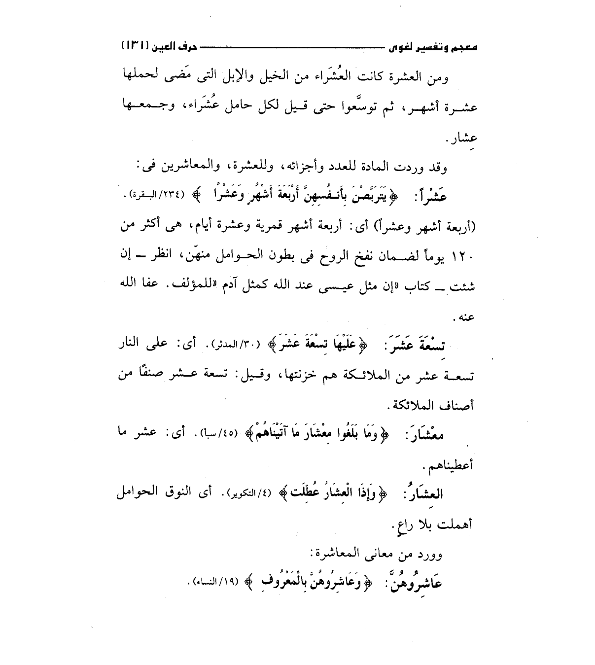 ومن العشرة كانت العُشَراء من الخيل والإبل التى مَضى لحملها عشرة أشهر , ثم توسعَّوا حتى قيل لكل حامل عُشَراء , وجمعها عِشار.