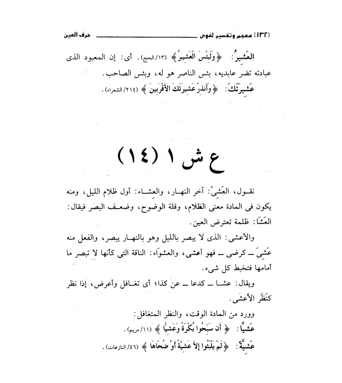 نقول , العَشِىّ: آخر النهار , والعِشاء: أول ظلام الليل , ومنه يكون فى المادة معنى الظلام , وقله الوضوح , وضعف البصر فيقال العَشَا: ظلمة تعترض العين.
