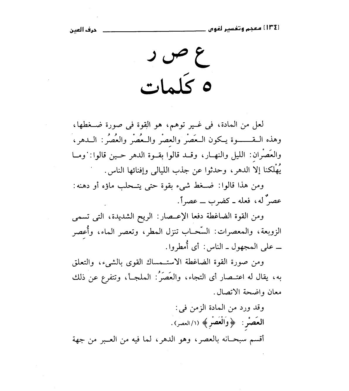 لعل من المادة , فى غير توهم , هو القوة فى صورة ضغطها , وهذه القوة يكون العَصْر والعُصُر: الدهر. والعَصُرِان: الليل والنهار , وقد قالوا بقوة الدهر حين قالوا: وما يُهْلكنا إلا الدهر , وحدثوا عن جذب الليالى وإفنائها الناس.