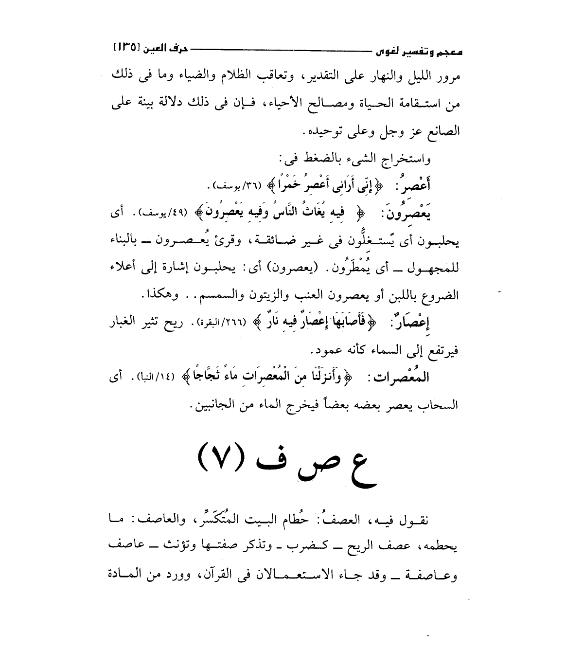 نقول فيه , العصفُ: خُطام البيت المُتَكَسَّر , والعاصف: ما يحطمه , عصف الريح - كضرب - وتذكر صفتها وتؤنث - عاصف وعاصفة - وقد جاء الاستعمالان فى القرآن , وورد من المادة
