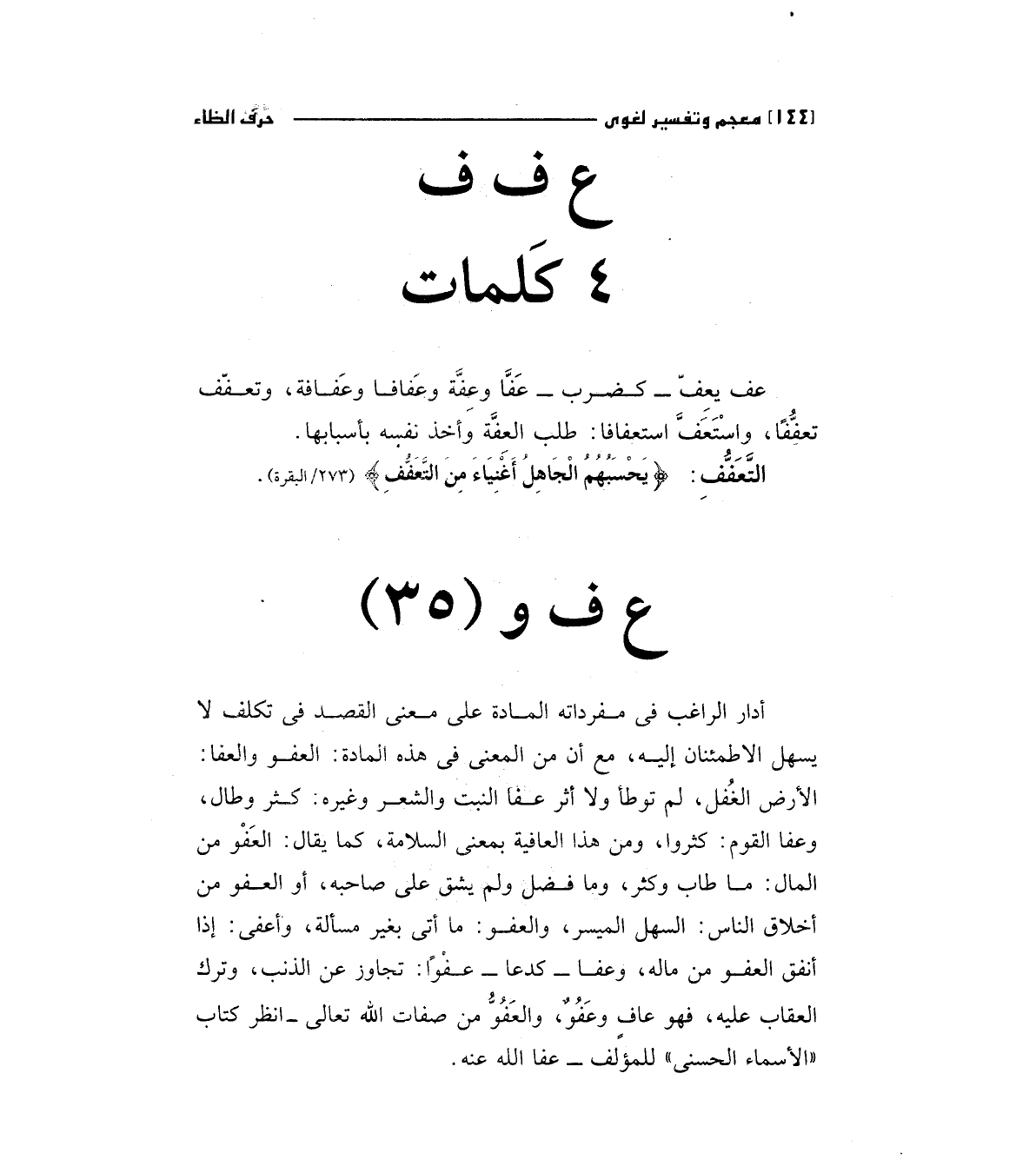 أدار الراغب في مفرداته المادة علي معني القصد في تكلف لا يسهل الاطمئنان غليه، مع أن من المعني في هذه المادة: العفو والعفا: الأرض الغفل، لم توطأ ولا أثر عفا النبت والشعر وغيره: كثر وطال، وعفا القوم: كثروا ومن هذا العافية بمعني السلامة، كما يقال: العفو من المال: ما طاب وكثر، وما فضل ولم يشق علي صاحبه، أو العفو من أخلاق الناس: السهل الميسر، والعفو: ما أتي بغير مسألة، واعفي: إذا أنفق العفو من ماله، وعفا - كدعا - عفوا: تجاوز عن الذنب، وترك العقاب عليهن فهو عاف وعفو، والعفو من صفات الله تعالي - انظر كتاب "الأسماء الحسني " للمؤلف - عفا الله عنه.