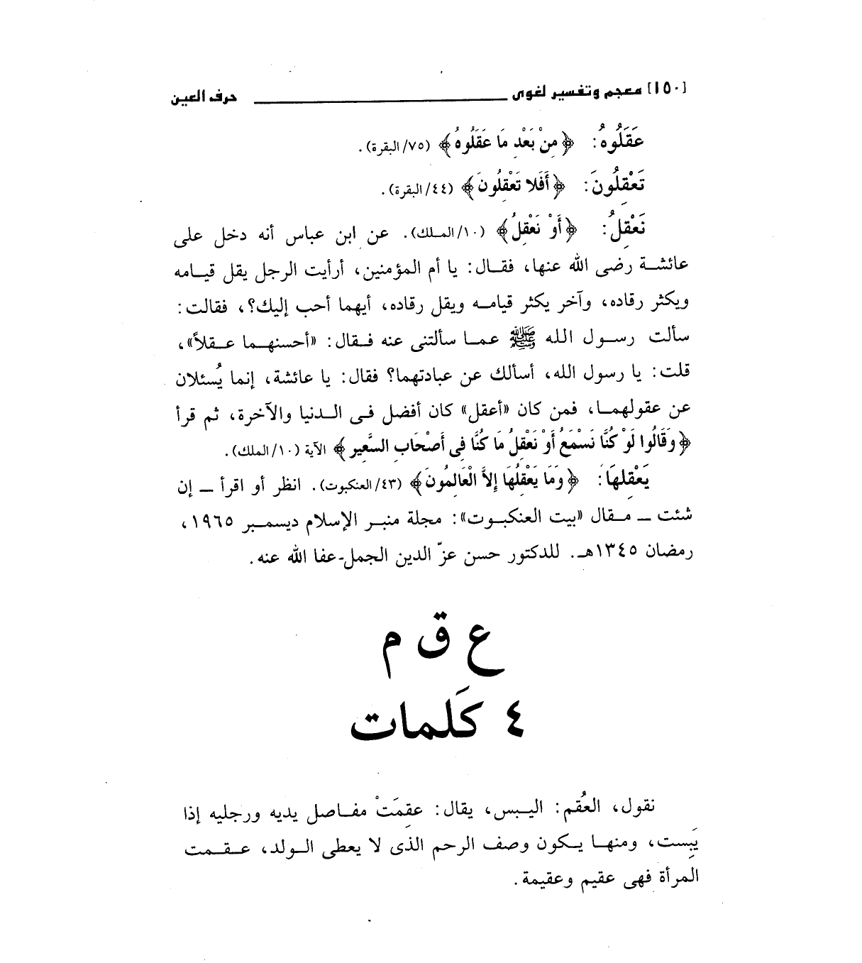 تعقل: (أَوْ نَعْقِلُ) (10/الملك) عن ابن عباس إنه دخل على عائشة رضى الله عنها، فقال: يا أم المؤمنين، أرأيت الرجل يقل قيامه ويكثر رقاده، وآخر يكثر قيامه ويقل رقاده، أيهما أحب إليك؟ فقالت: سألت رسول الله صلى الله عليه وسلم عما سألتني عنه فقال: " أحسنها عقلا " قلت: يا رسول الله، أسألك عن عبادتهما؟ فقال: يا عائشة، إنما يسئلان عن عقولها، فمن كان " أعقل " كان أفضل فى الدنيا والآخرة، ثم قرأ - (وَقَالُوا لَوْ كُنَّا نَسْمَعُ أَوْ نَعْقِلُ مَا كُنَّا فِي أَصْحَابِ السَّعِيرِ) (10/الملك)