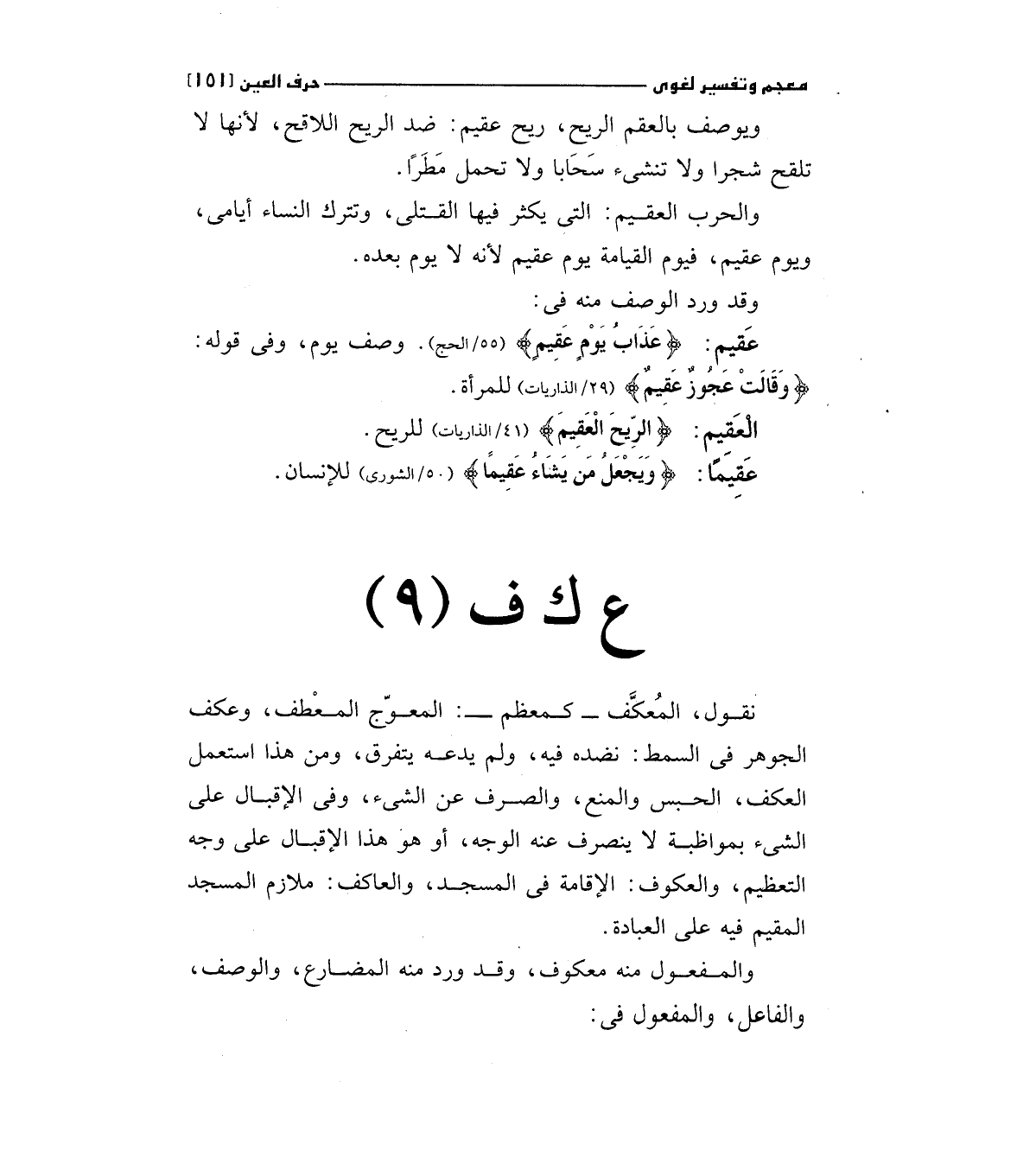 نقول، المعتكف - كمعظم -: المعوج المعطف، وعكف الجوهر فى السمط: نضده فيه، ولم يدعه يتفرق، ومن هذا استعمل العكف، الحبس والمنع، والصرف عن الشىء، وفى الإقبال على الشىء بمواظبة لا يتصرف عنه الوجه، أو هو هذا الإقبال على وجه التعظيم، والعكوف: الإقامة فى المسجد، والعاكف: ملازم المسجد المقيم فيه على العبادة.