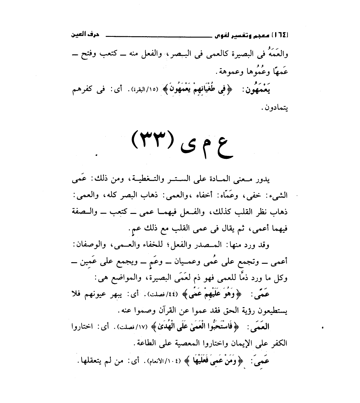 عمى: (وَمَنْ عَمِيَ فَعَلَيْهَا) (104/الأنعام) أى: من لم بتعقلها.