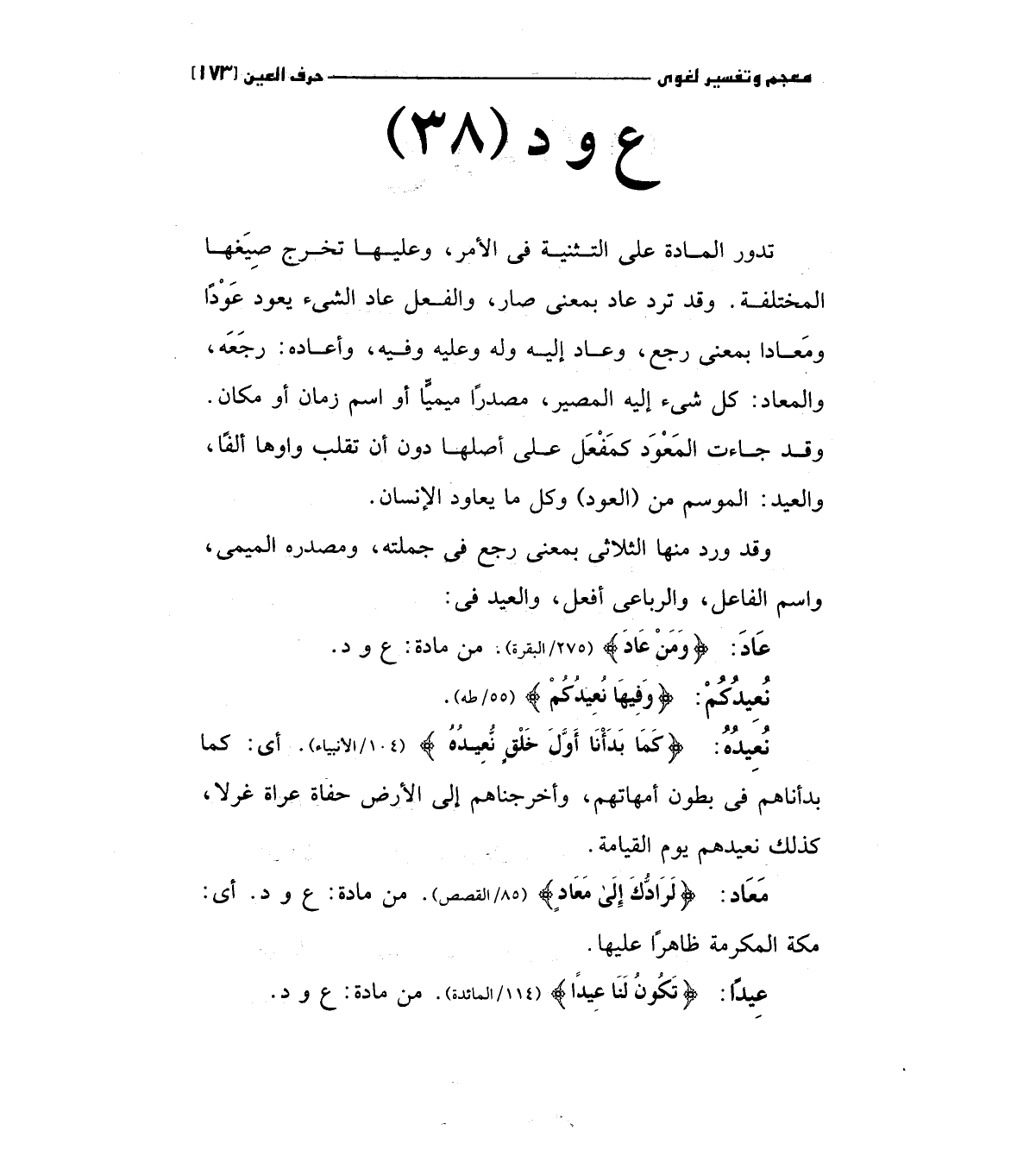 تدور المادة علي التثنية في الأمر، وعليها تخرج صيغها المختلفة، وقد ترد عاد بمعني صار، والفعل عاد الشئ يعود عودا ومعادا بمعني رجع، وعاد إليه وله وعليه وفيه، وأعاده: رجعه، والمعاد: كل شئ إليه المصير، مصدرا ميميا أو اسم زمان أو مكان. وقد جاءت المعود كمفعل علي أصلها دون أن تقلب واوها ألفا ن والعيد: الموسم من (العود) وكل ما يعاود الإنسان.