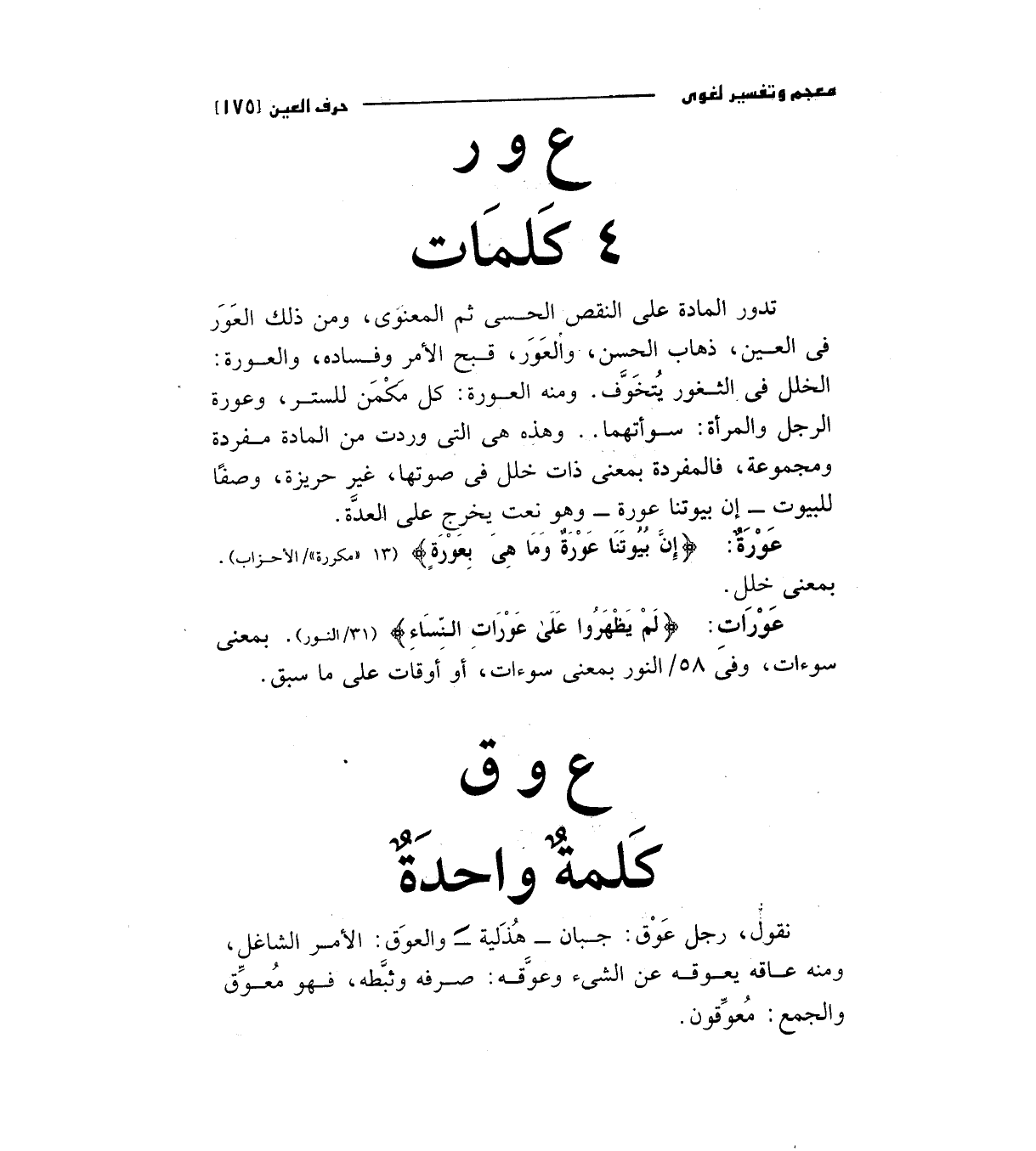 تدور المادة علي النقص الحسي ثم المعنوي، ومن ذلك العور في العين، ذهاب الحسن، والعور، قبح الأمر وفساده، والعورة: الخلل في الثغور يتخوف. ومنه العورة: كل مكمن للستر، وعورة الرجل والمرآة: سوأتهما ... وهذه هي التي وردت من المادة مفردة ومجموعة، فالمفردة بمعني ذات خلل في صوتها، غير حريزة، وصفا للبيوت - إن بيوتنا عورة - وهو نعت يخرج علي العدة