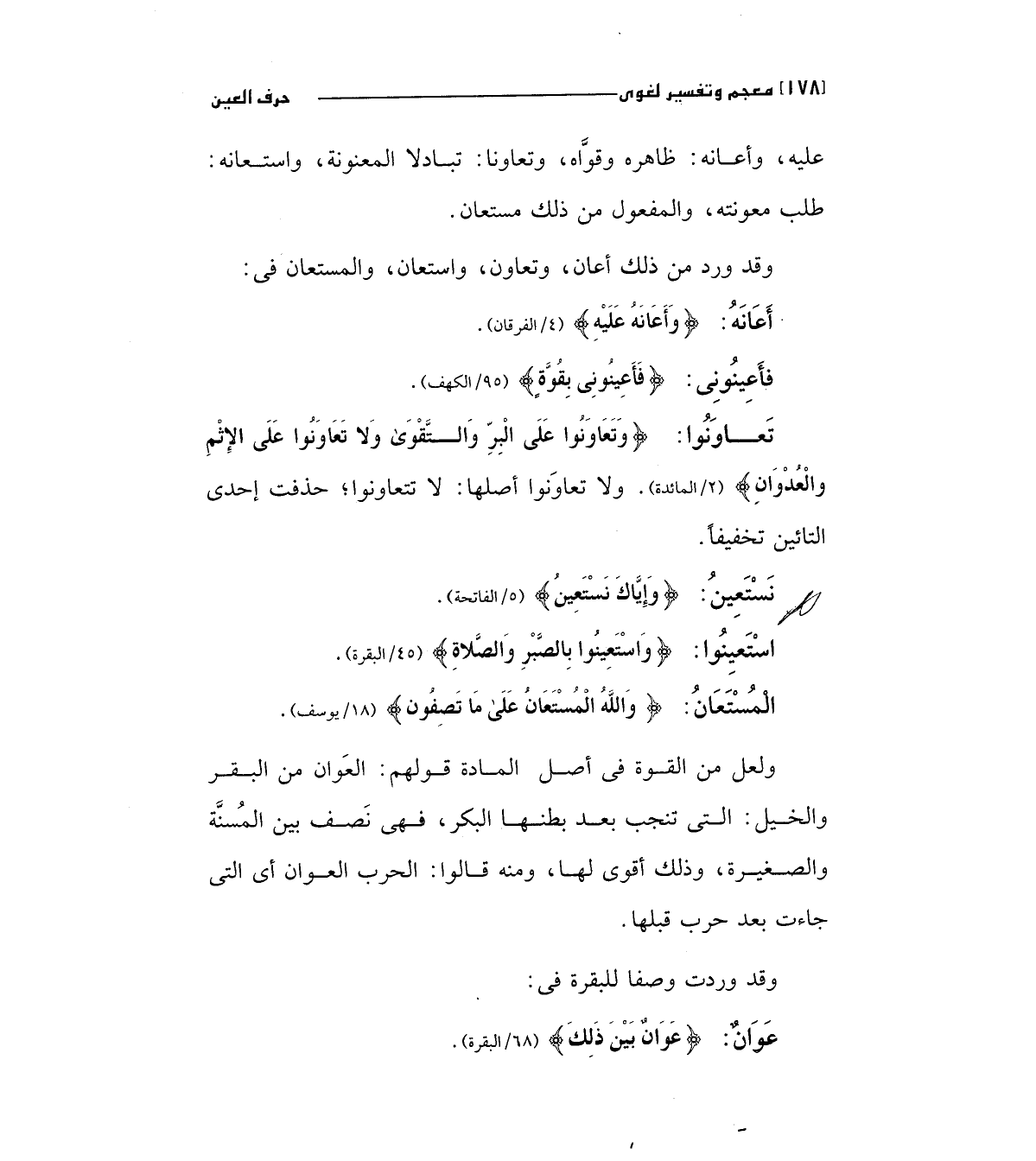 وقد ورد من ذلك أعان، وتعاون واستعان، والمستعان في: أعانه: (وَأَعَانَهُ عَلَيْهِ) " 4/الفرقان".