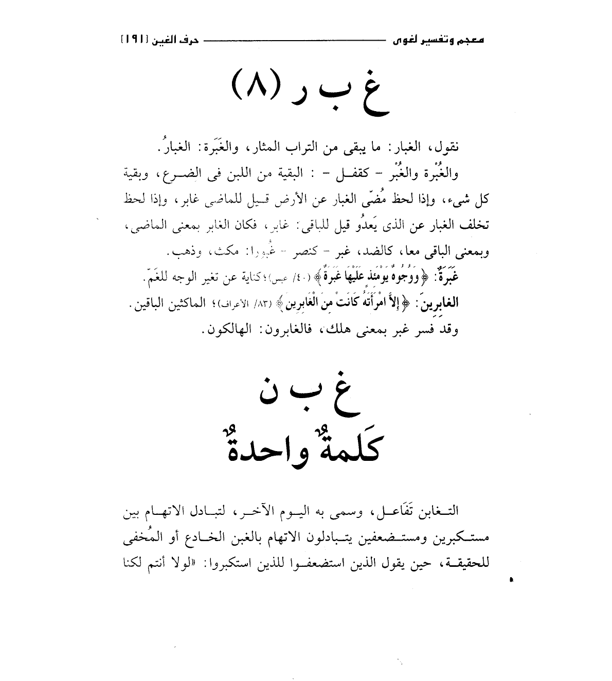 الغابرين: (إِلاَّ امْرَأَتَهُ كَانَتْ مِنْ الْغَابِرِينَ) " 83/الأعراف " الماكثين الباقين. وقد فسر غبر بمعني هلك، فالعابرون: الهالكون.