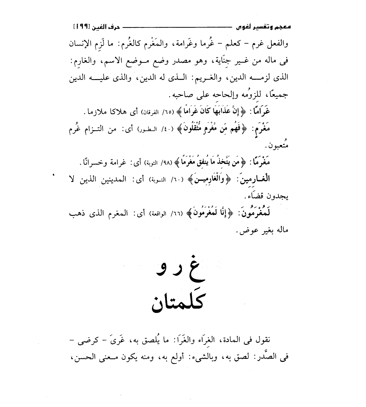 غراما: (إِنَّ عَذَابَهَا كَانَ غَرَاماً) " 65/الفرقان " أي هلاكا ملازما مغرم: (فَهُمْ مِنْ مَغْرَمٍ مُثْقَلُونَ) " 40/الطور " أي: من التزام غرم متعبون.